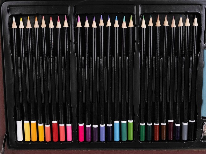 - Много элементов - набор для рисования в чемодане имеет много элементов, в том числе: 60 восковых цветов, 24 пастели, 24 деревянных карандаша, 24 краски для воды, дополнительно 2 щетки, темпера, 8 абразивных бумаг, ластик, два карандаша HB и 2B.