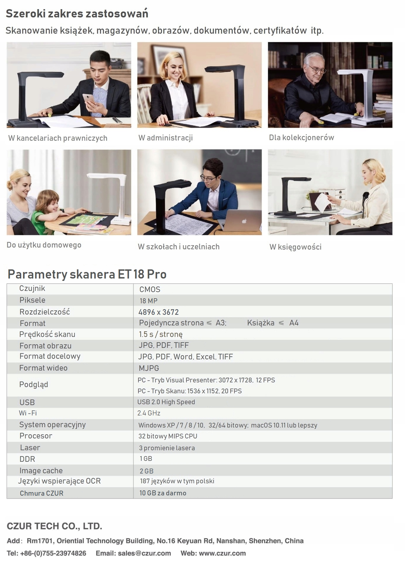 Czur ET 18 Pro — профессиональный книжный сканер с поддержкой формата A3, идеально подходящий для компаний, офисов и профессионалов. Он позволяет легко, быстро и удобно сканировать документы, книги, бланки, счета и старые архивы без риска их уничтожения. Маленький и простой в использовании Он был специально разработан для бухгалтерских контор, юридических фирм, нотариусов, библиотек, школ и т. д. для архивирования и оптической обработки документов.