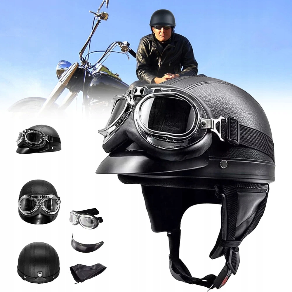 винтажный кожаный кожаный мотоцикл мотоциклетный шлем с солнцем козырьком + ветрозащитные очки + теплый шарф (черный) h1>