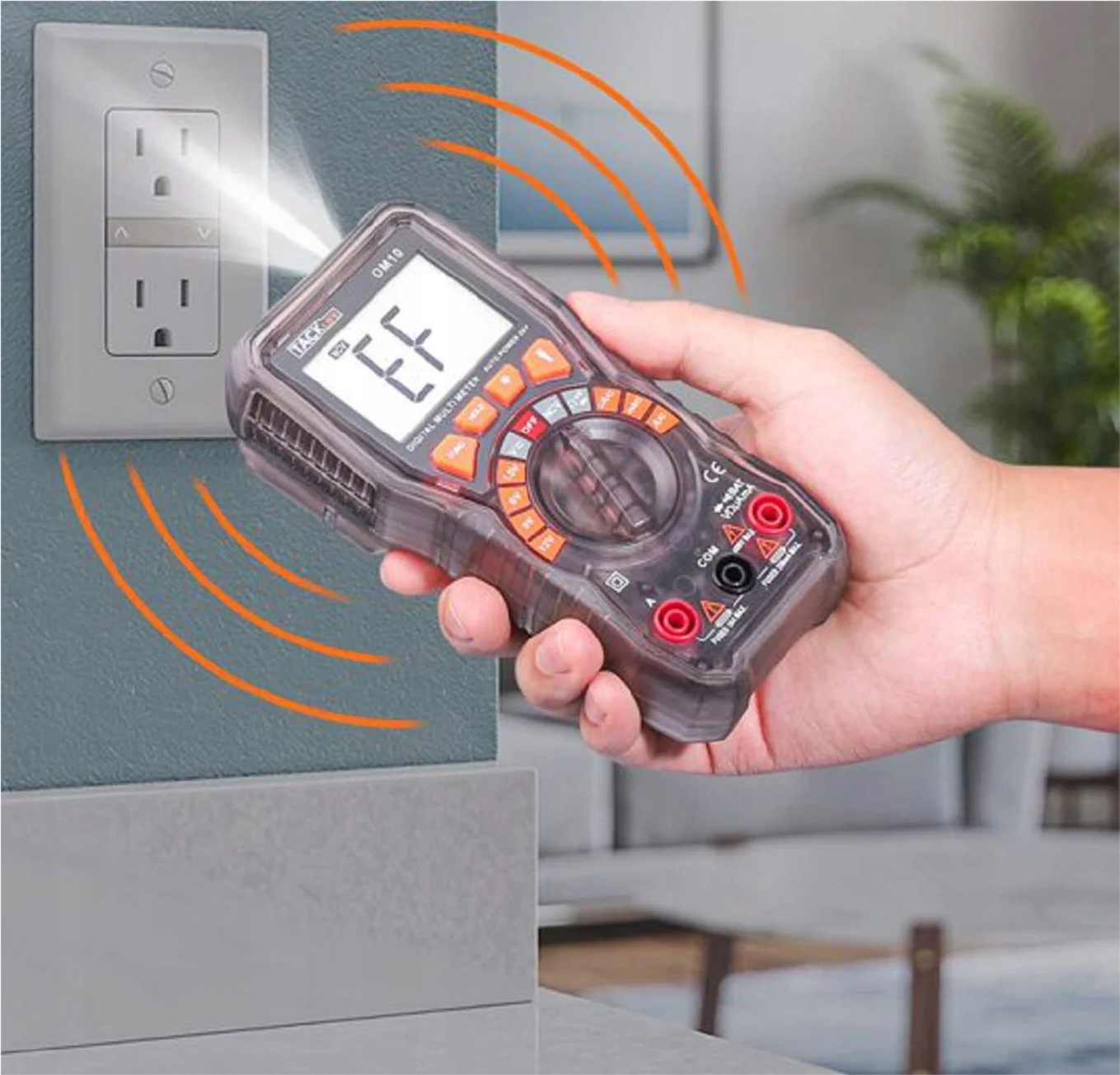 Встроенный бесконтактный детектор напряжения переменного тока. При измерении напряжения выше 90 В загорается фонарик и звучит зуммер, обеспечивая безопасность. Устройство автоматически выключается через 15 минут бездействия для экономии энергии.