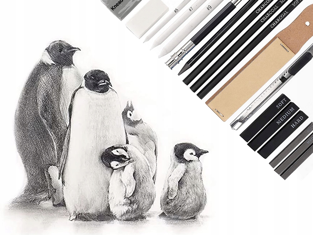 В набор входят карандаши различной твердости, угольный карандаш, графитовый карандаш, графитовые палочки, угольные палочки, блендеры, нож, удлинитель, ластики, точилки, наждачная бумага.
