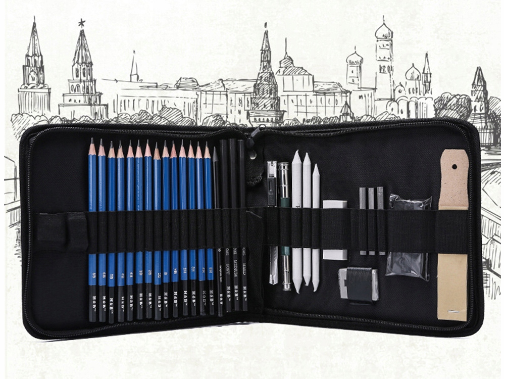 В набор входят карандаши различной твердости, угольный карандаш, графитовый карандаш, графитовые палочки, угольные палочки, блендеры, нож, удлинитель, ластики, точилки, наждачная бумага.