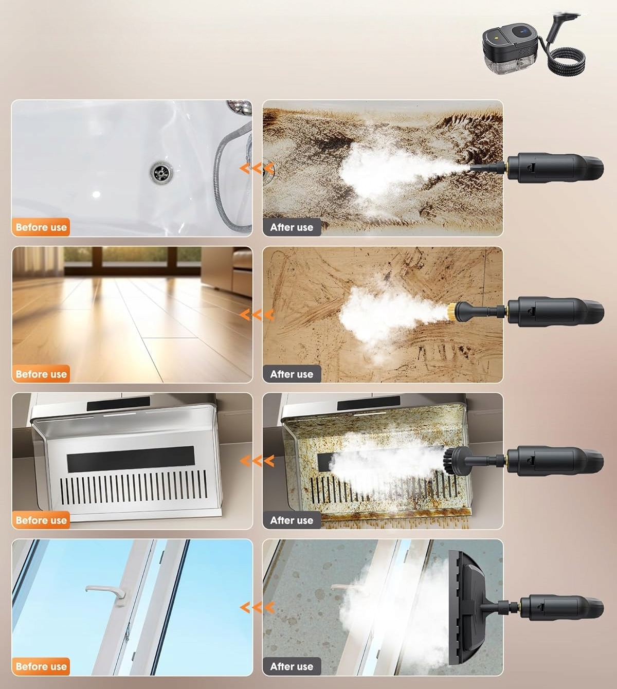 - Многосценное использование: Эффективно очищайте и дезинфицируйте ванные комнаты, кондиционеры, кухонные поверхности, ковры, окна и салон автомобиля с помощью одного эффективного устройства.