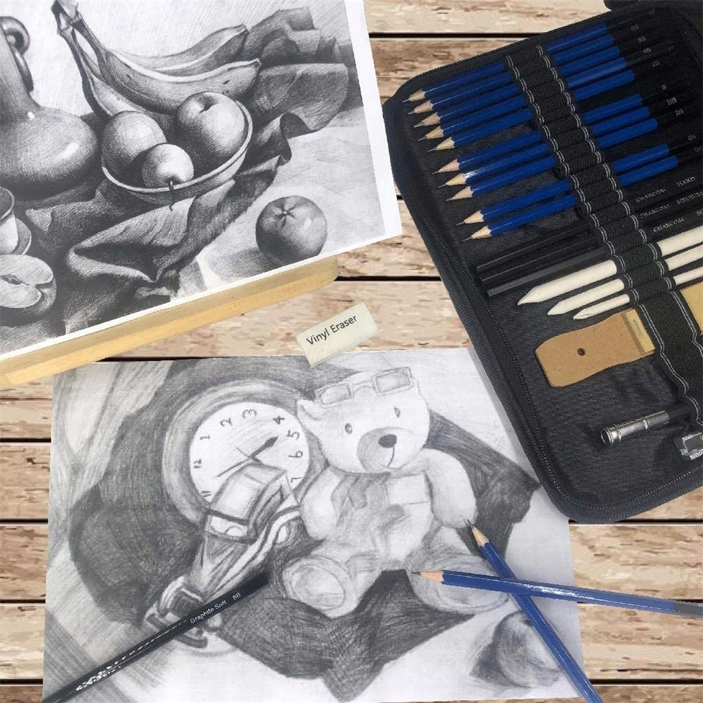 12 карандашей разной твердости и 3 угольных карандаша сделают ваши эскизы очень реалистичными.