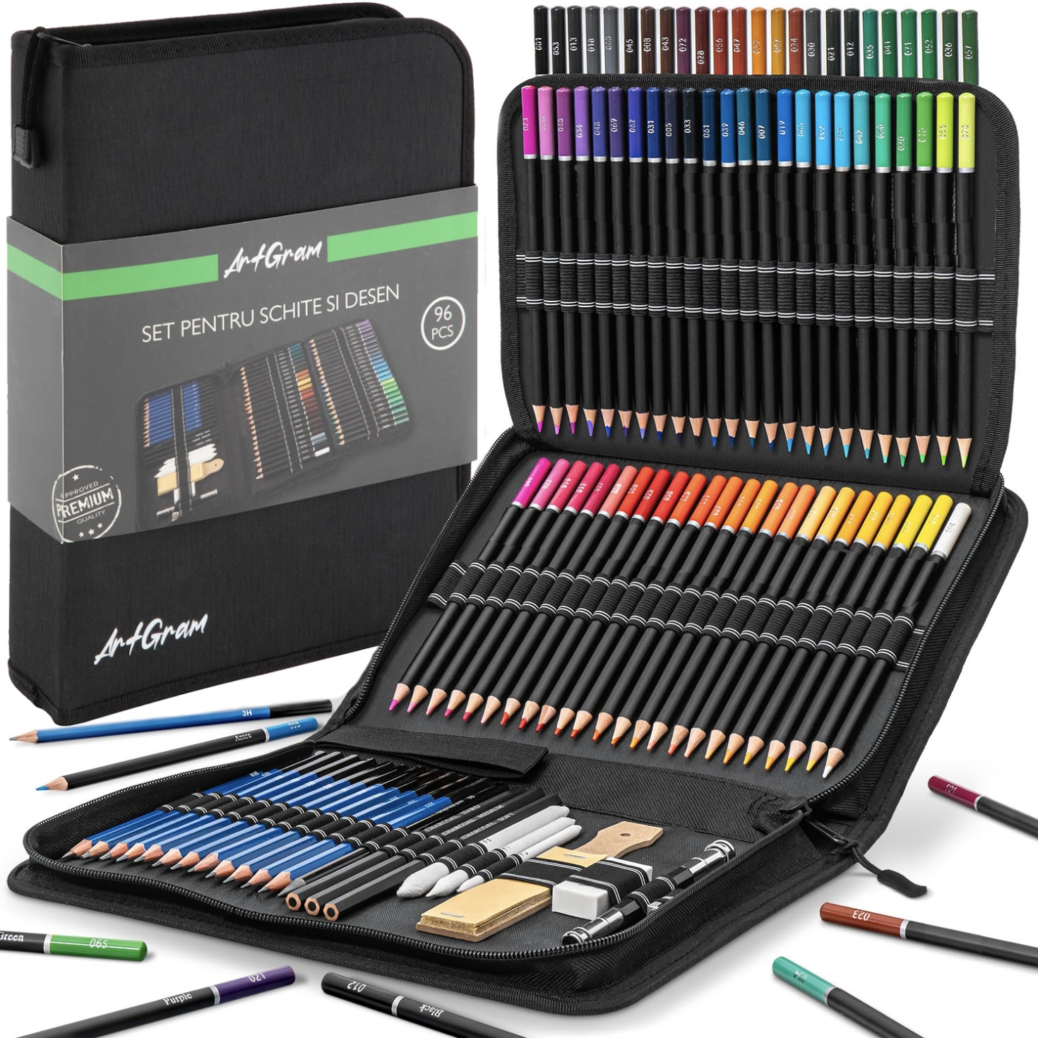 ✍️ Удобные аксессуары, такие как удлинитель карандаша, ластик, точилка, нож, листы бумаги и удобный футляр, позволяют легко сразу приступить к рисованию.