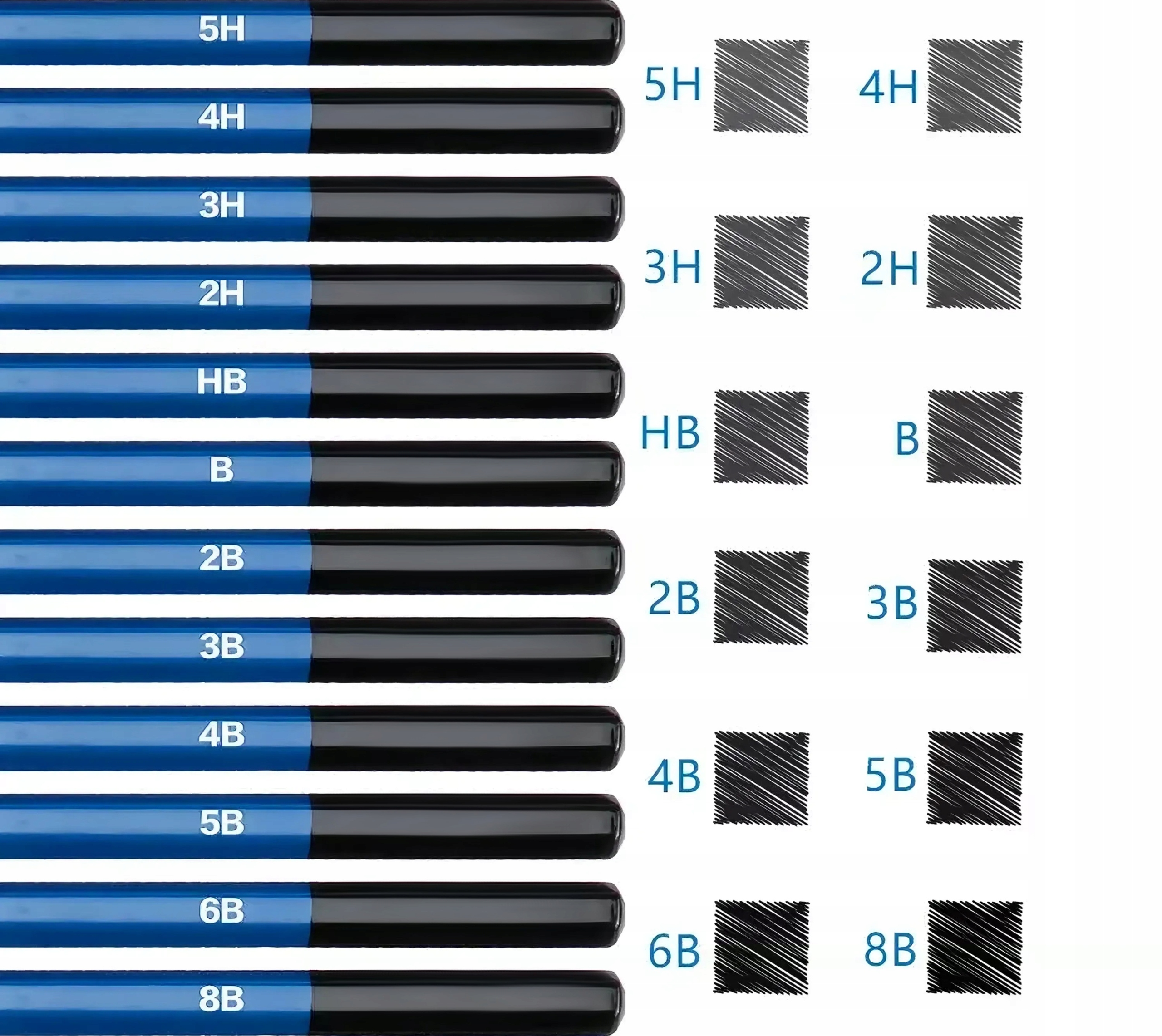✔️ В наборе 12 видов карандашей. Их твердость можно узнать по символам 2H/3H/4H/5H/HB/B/2B/3B/4B/5B/6B/8B.