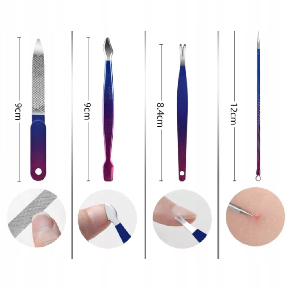 ✅ Уникальный дизайн градиента - комбинация фиолетового и синего придает инструментам современный, эстетический вид, отличая набор от стандартных аксессуаров. Каждый - идеально подходит для мужчин и женщин, для домашнего использования и во время путешествий, гарантируя хорошо подготовленные руки, ноги и лицо.