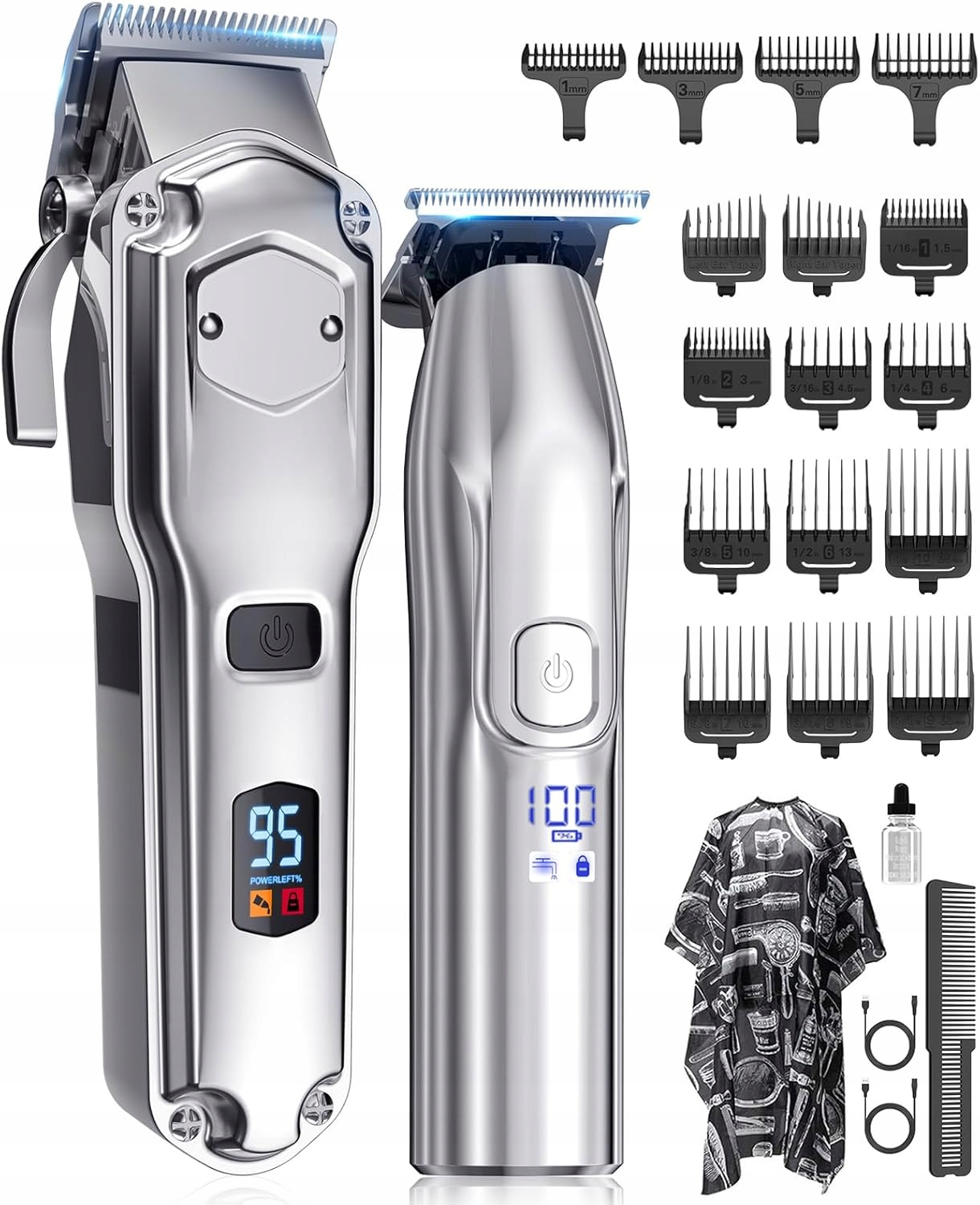 - Набор машинки для стрижки волос - машинка для стрижки волос, триммер с Т-образным лезвием, 10 насадок-направляющих для машинки и 4 насадки-направляющих для триммера, смазочное масло, чистящая щетка и фартук для ухода, 2 USB-кабеля, одна сумка. Один набор машинок для стрижки волос для любых задач по стрижке!