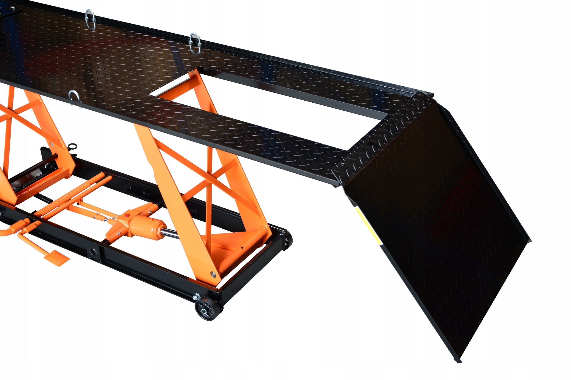 Мотоподъемник грузоподъемностью 450 кг с рампой, оснащенный гидроцилиндром и специальным монтажным отверстием, обеспечивающим быстрый доступ к мотоциклу снизу