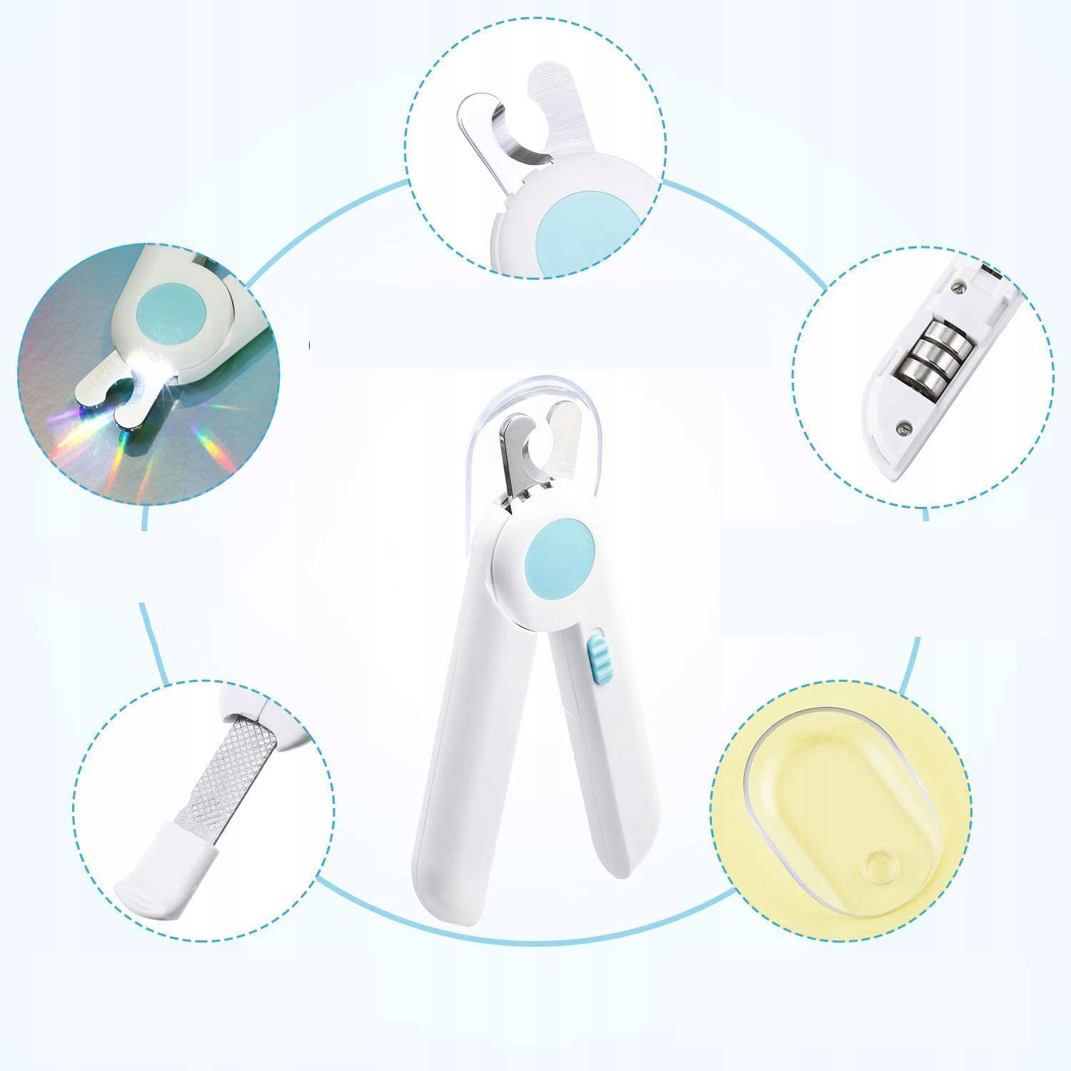 💡💡【Дизайн со светодиодной подсветкой】Машинка для стрижки когтей для домашних животных имеет встроенный светодиод, яркий светодиодный свет может четко освещать линию крови, предотвращать кровотечение из ногтей, вызванное чрезмерной обрезкой, и защищать здоровье домашних животных.