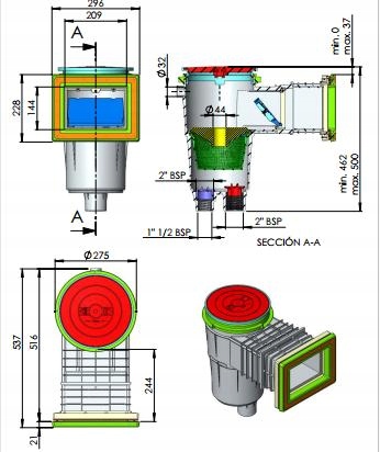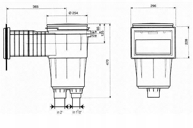 Размеры входного отверстия скиммера: 296 x 228 мм.