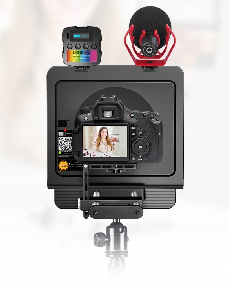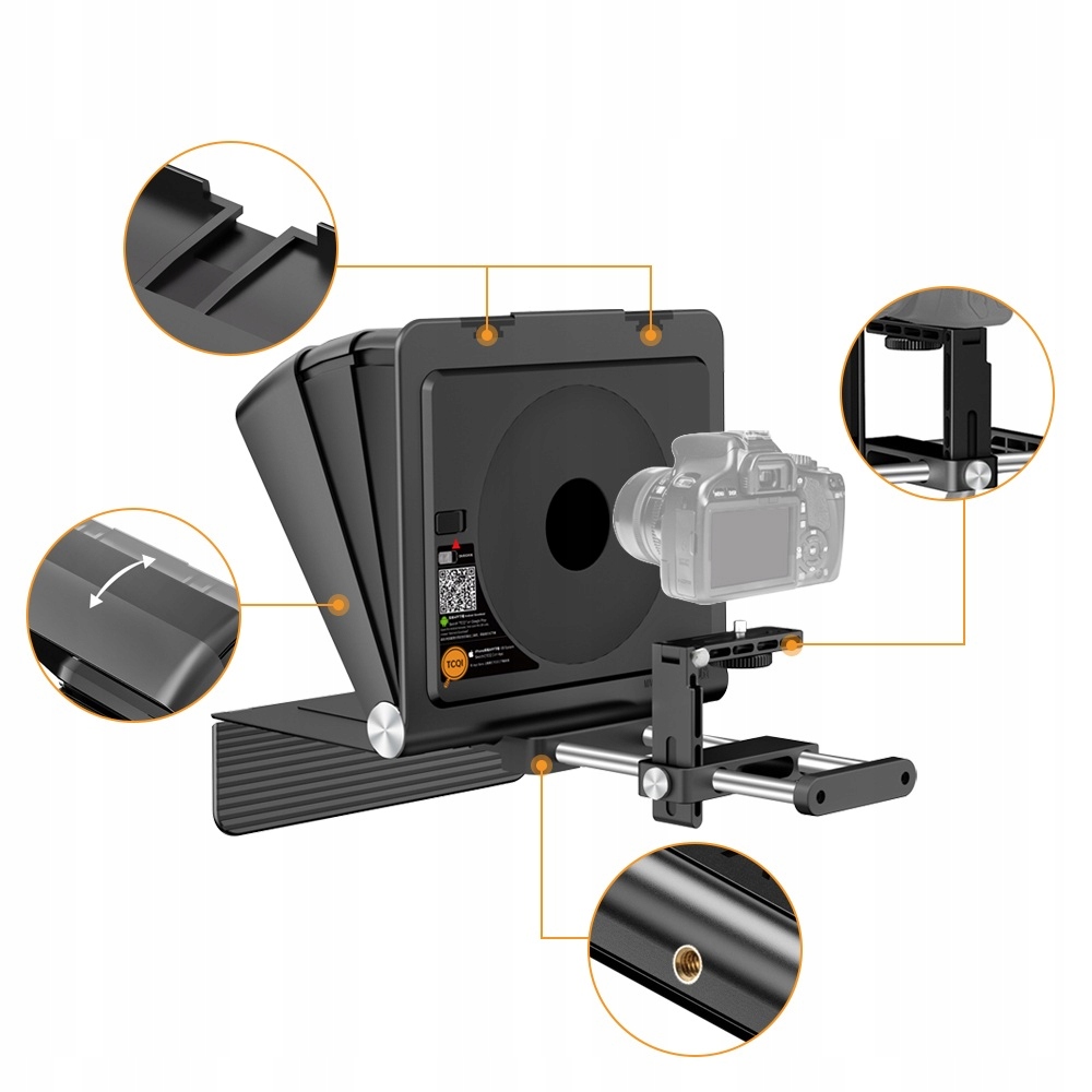 ✔️ Совместимость с фотоаппаратами, видеокамерами, телефонами - телесуфлер позволяет записывать изображения с фотокамер (в том числе зеркальных) и видеокамер с монтажной резьбой 1/4" и телефонов. держатель и регулируемую направляющую для крепления фотоаппарата/видеокамеры
