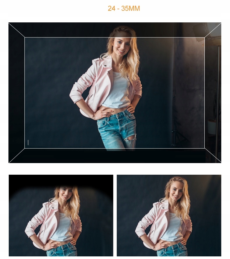 ✔️ Поддержка широкоугольных объективов 24–35 мм – отсутствие виньетирования и темных углов в кадре