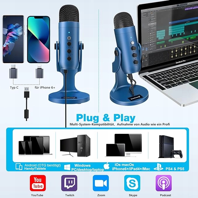 - 【 Что Вы получаете】 1 * синий USB-микрофон K66 для компьютеров и телефонов. с синей внешней цельнометаллической подставкой для микрофона 1 * кабель USB-A; 1 * USB-адаптер для iPhone; 1 * адаптер Type-C для устройств USB-C (мобильный телефон, планшет и компьютер); 1 * черный пенопластовый чехол для микрофона; 1 * руководство пользователя без польского языка