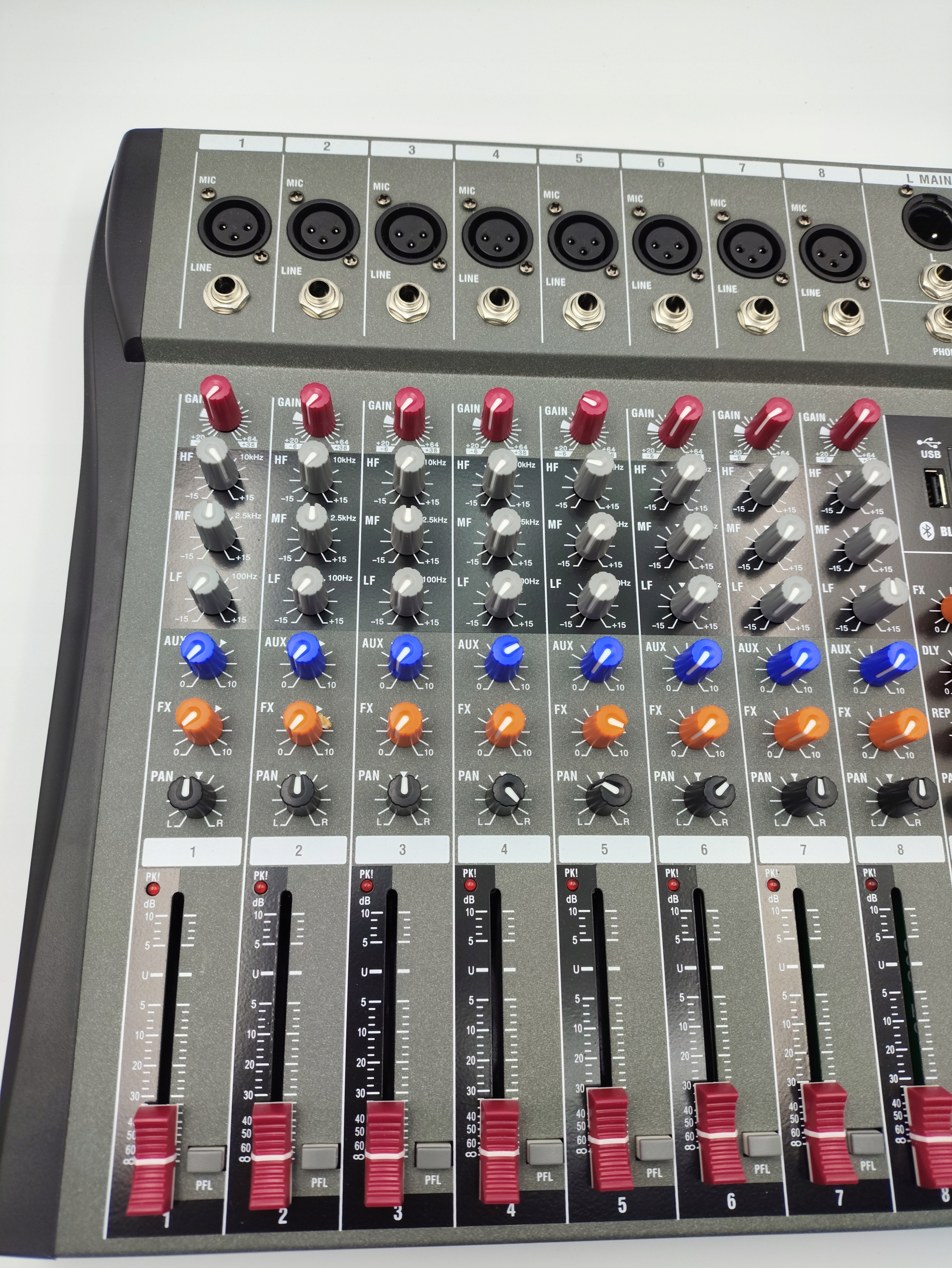 Микшер предлагает богатый набор функций: встроенный -ин интерфейс Bluetooth, вход USB/MP3, разъемы XLR и RCA, а также питание Phantom 48V - необходимо для работы с микрофонами емкости. Устройство обеспечивает высокое качество звука благодаря точным предусилителям и низкой архитектуре. Каждый канал имеет независимые регуляторы, а эргономическая планировка панели обеспечивает интуитивную работу.