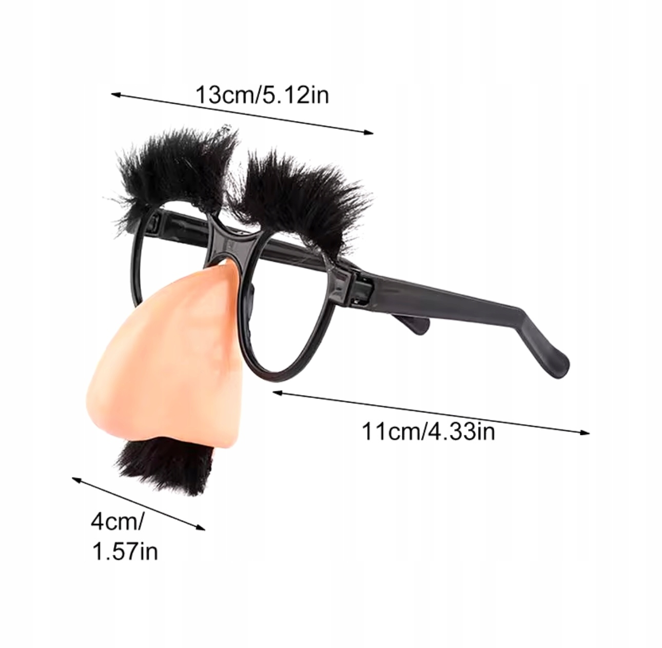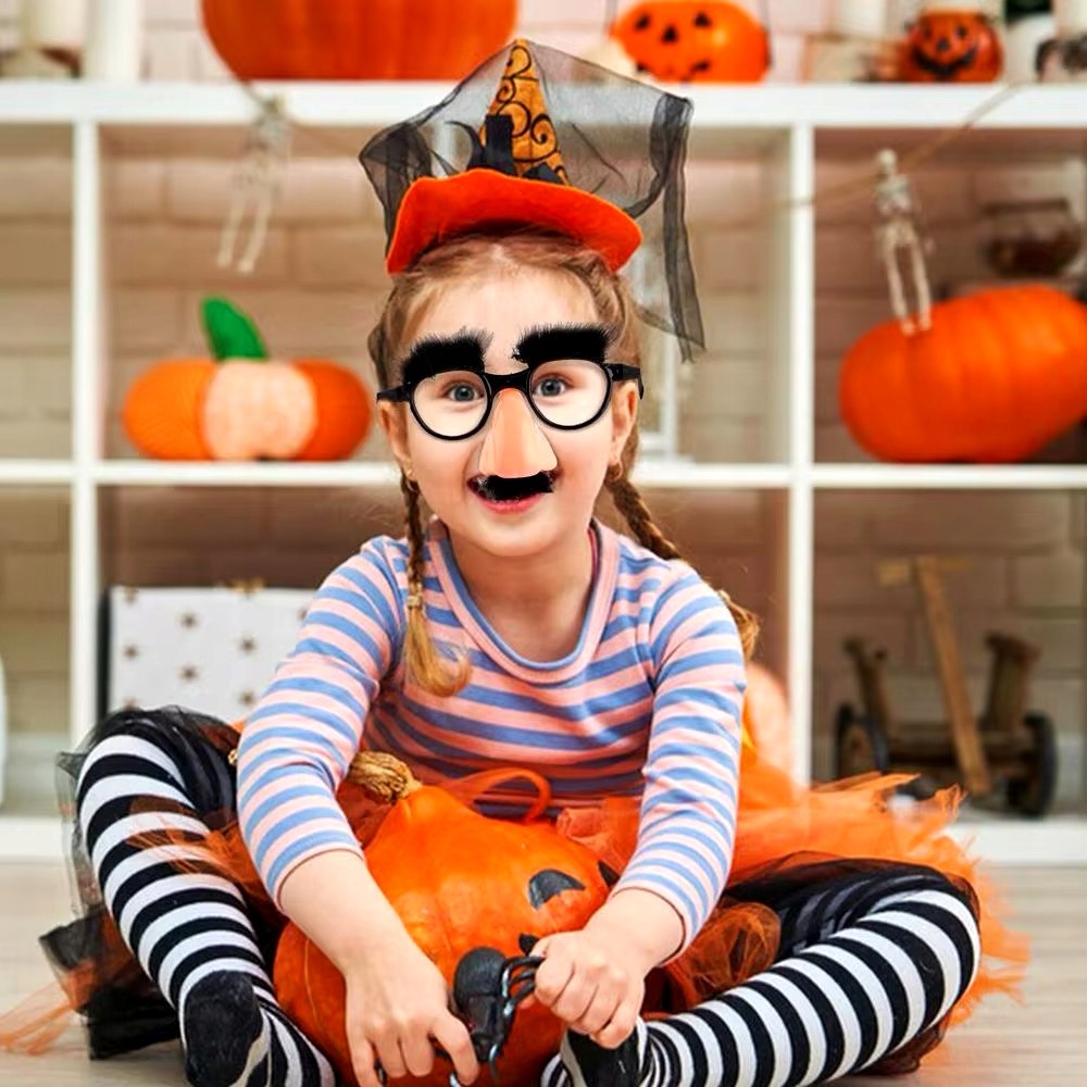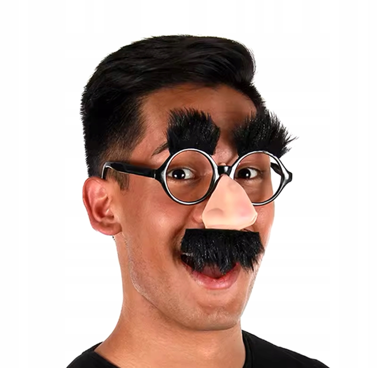 Очки имеют искусственные черные брови и усы и большой искусственный нос.