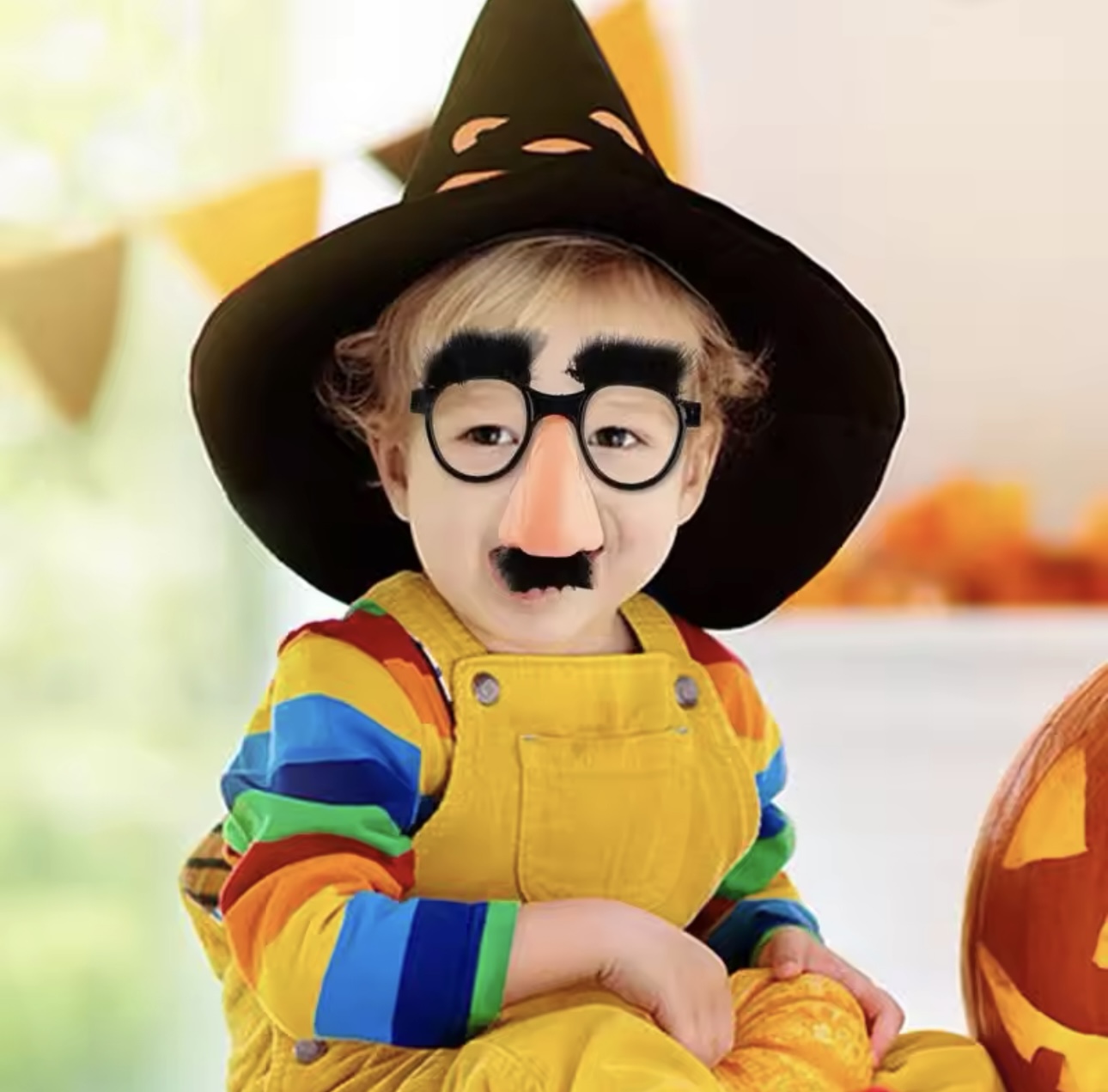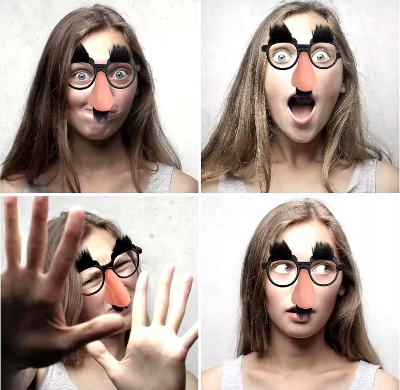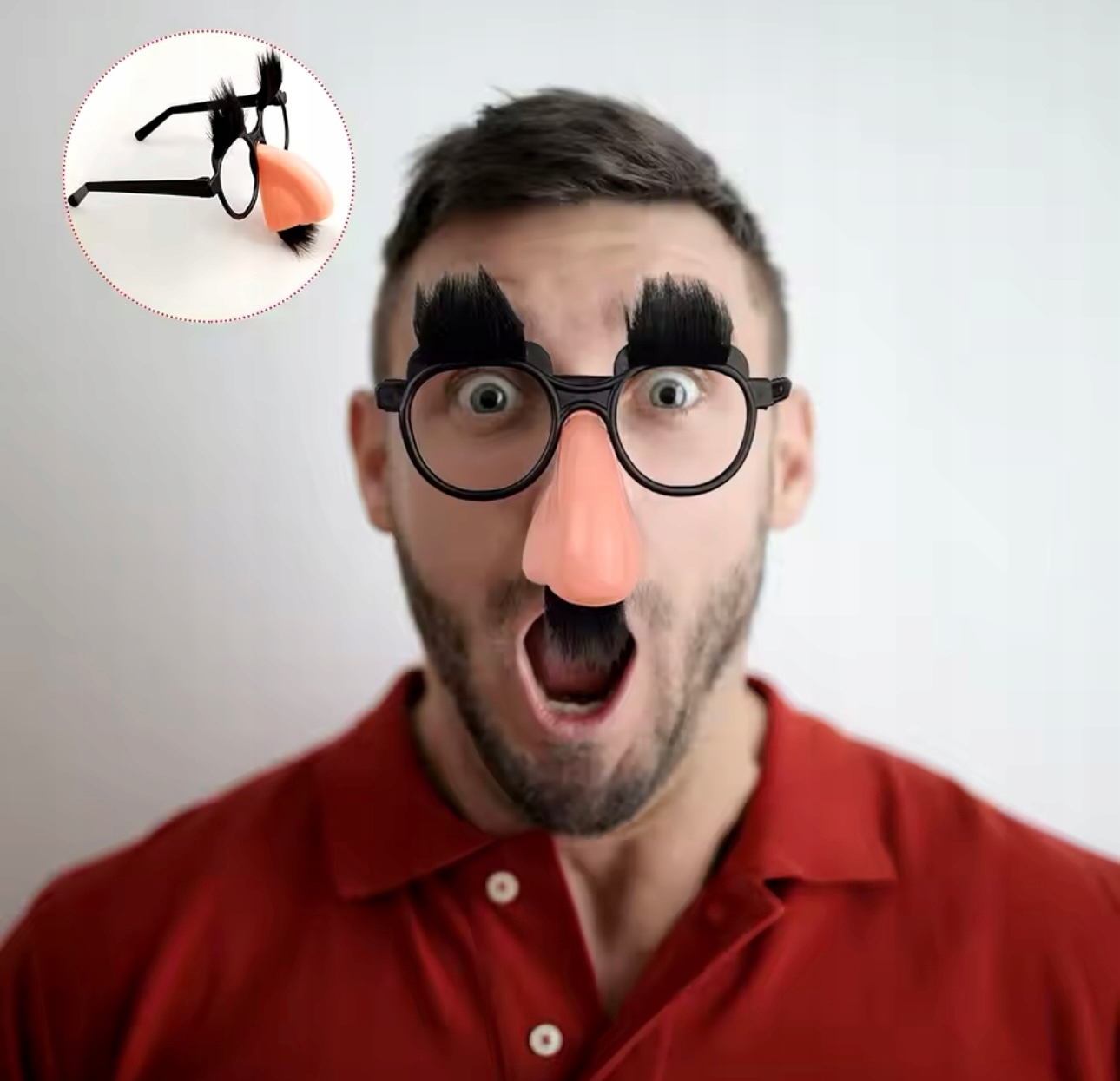 Очки имеют искусственные черные брови и усы и большой искусственный нос.