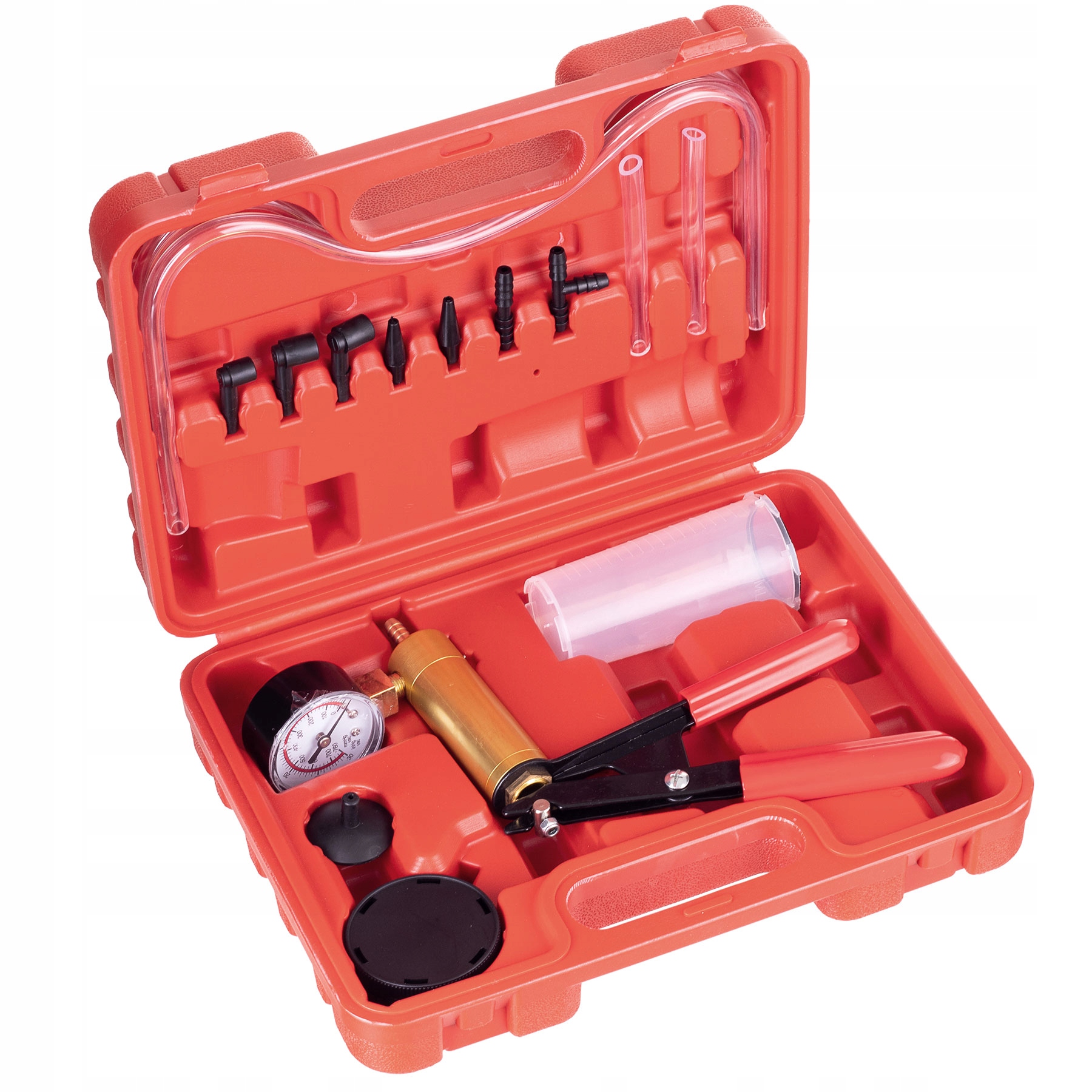 вакуумный насос и не хватает набора кровотечения для автомобильных легких тормозов и самостоятельно тестируйте автомобильные вакуумные системы. Работает над всеми автомобилями и моделями. Комплексный комплект вакуумных насосов мастерской включает в себя адаптер резервуара и сосков для кровотечения для тормоза и топливной линии. Насос, работающий с ручным управлением, протягивает жидкость через кровотечение, устраняя необходимость использования рычага или педали тормоза.