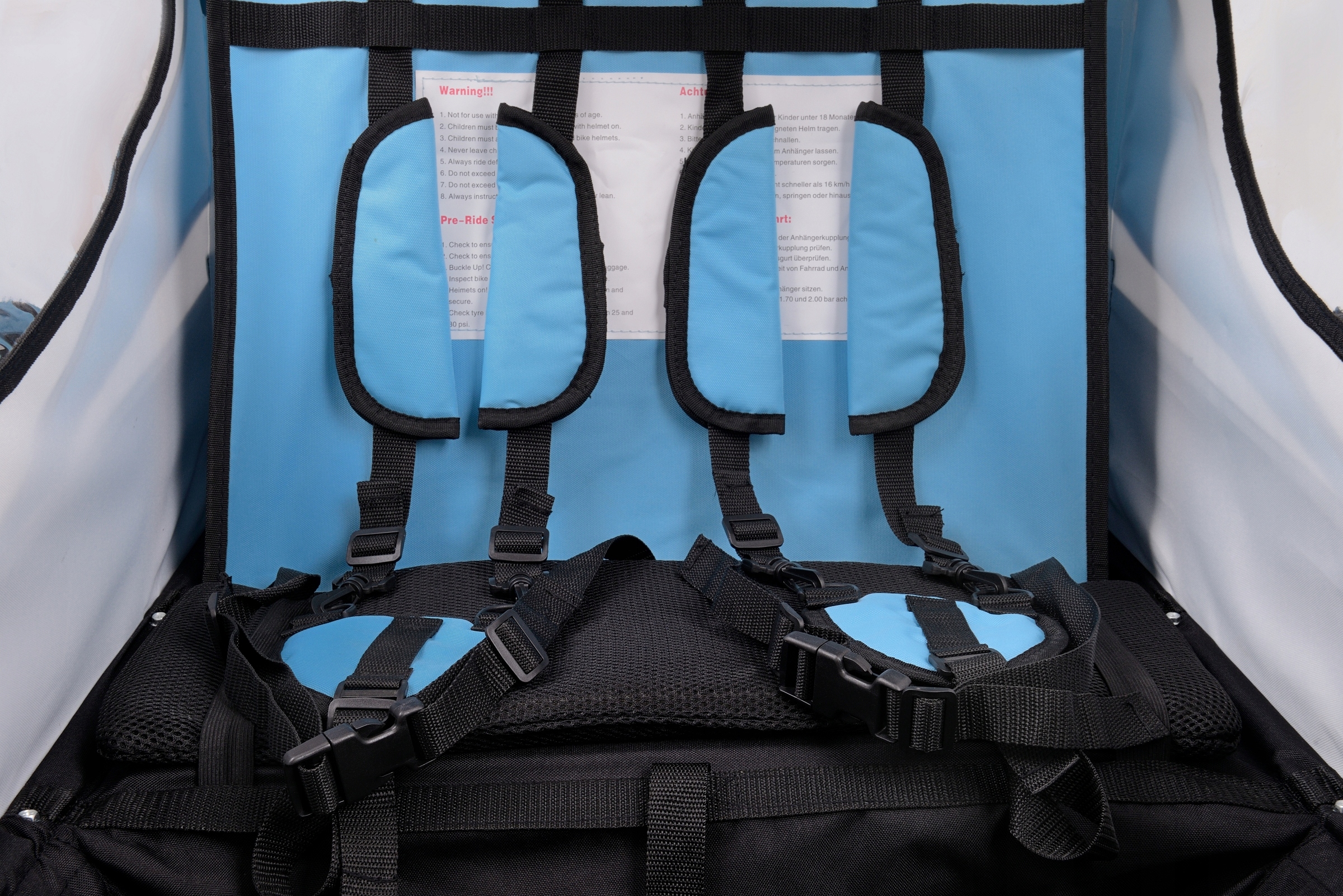 Внутри прицепа оборудованы ремнями безопасности, обеспечивающие безопасность наших детей. На сиденье имеется подушка, обеспечивающая комфортное сидение.