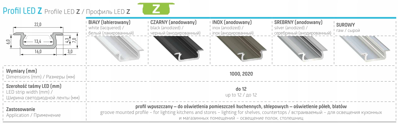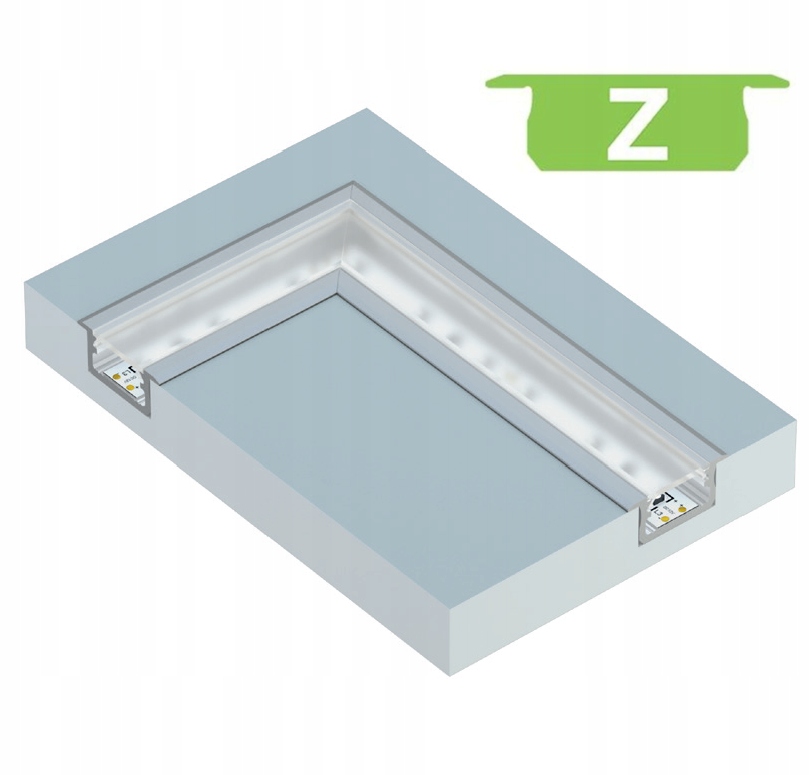 Алюминиевый профильZ для утопления в отверстия, фрезерованные на поверхности. Один из самых минималистичных и современных дизайнов. Идеально подходит для установки внутри фрезерованного отверстия. Минимальная необходимая глубина отверстия — всего 6 мм.