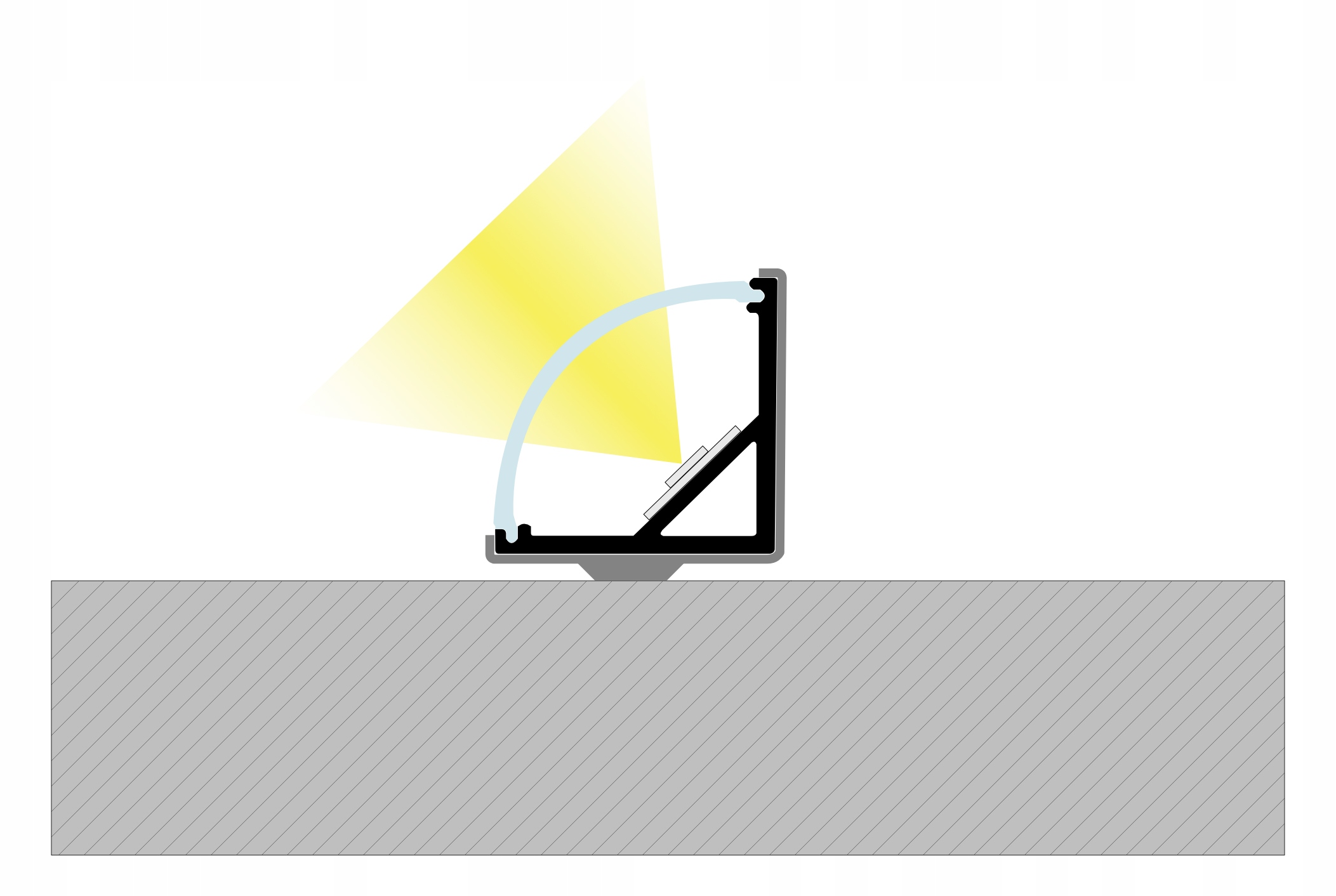 Он идеально подходит для соединения двух перпендикулярных поверхностей и там, где необходимо направить свет, выходящий из светильника. профиль под углом 45 градусов.
