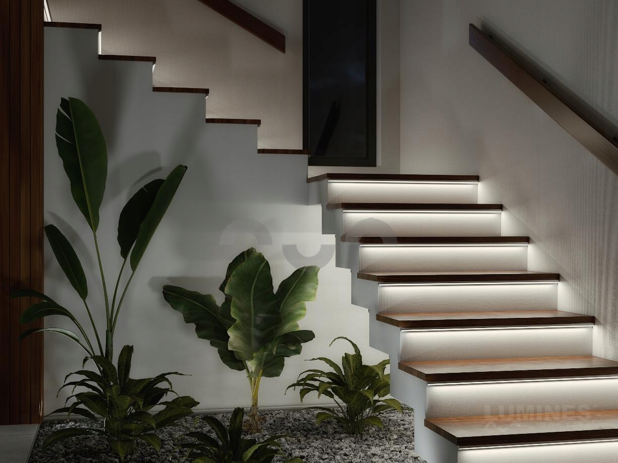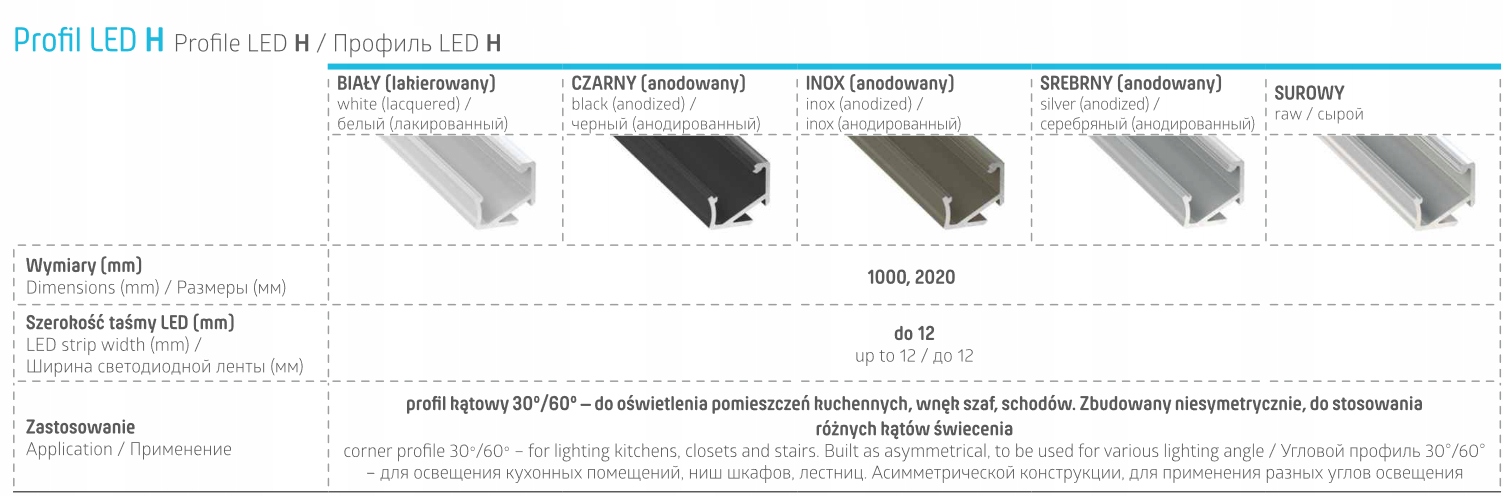 h представляет собой алюминиевый профиль на угловой поверхности 30 °/60 °. Для освещающих кухонных комнат, шкафов, столешниц. Построен асимметрично для использования различных углах освещения. Один из самых минималистских и современных проектов. Отлично подходит для дизайнерских соединений двух перпендикулярных поверхностей, и где бы ни было необходимо направлять свет из профиля под углом 30 °/60 °