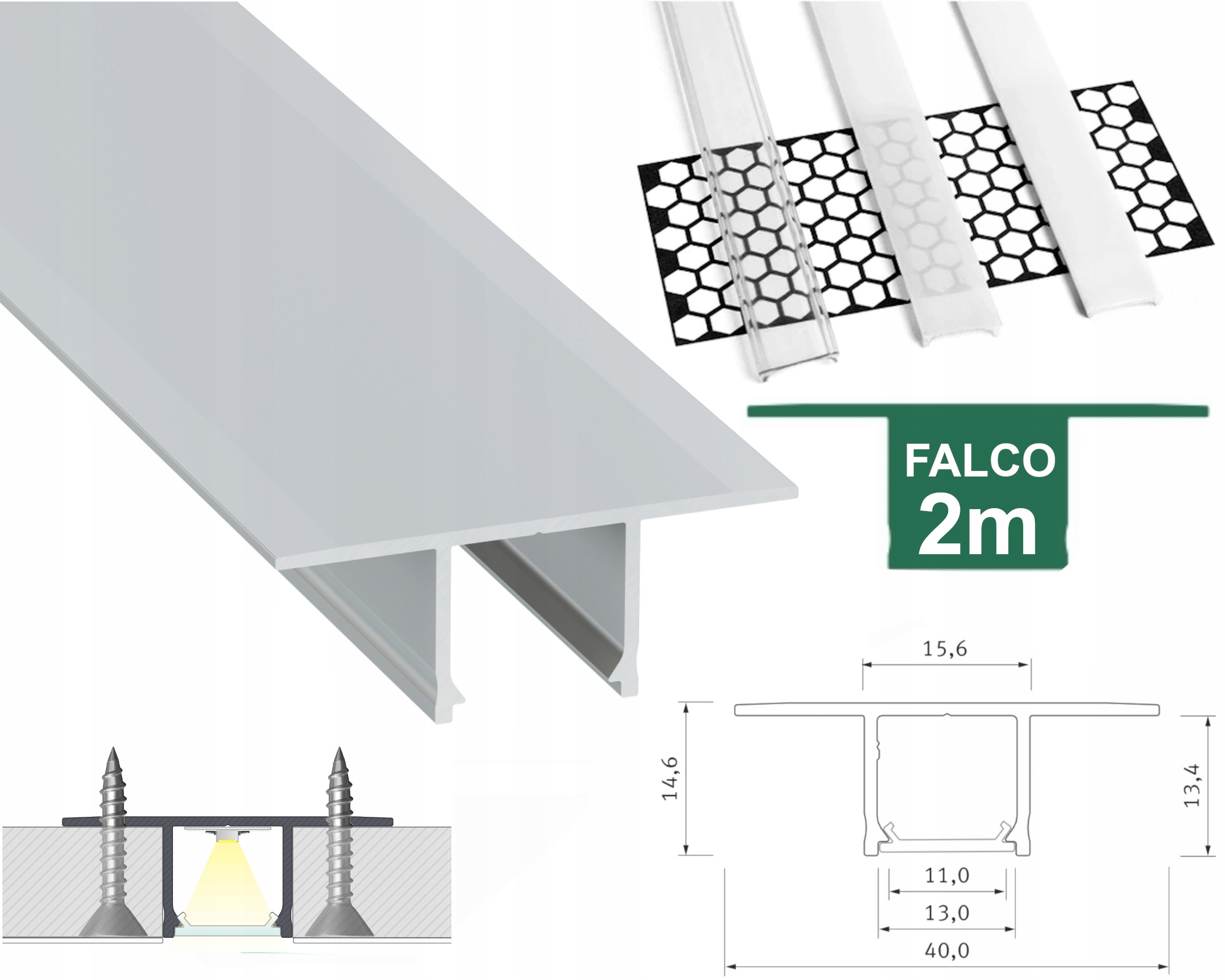 Алюминиевый профиль типа FALCO предназначен для встраиваемого монтажа и имеет широкий спектр применения. Одиночный светодиодный профиль для установки между двумя гипсокартонами. Позволяет осуществлять быстрый монтаж с помощью шурупов и отделку шпаклевкой без необходимости использования монтажной сетки.