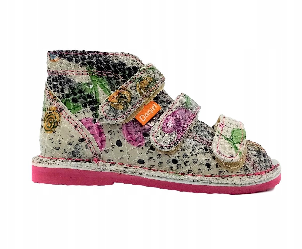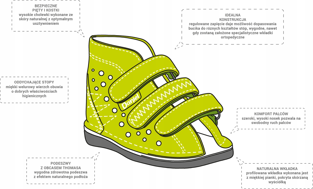 Сандалии DANIEL имеют высокий жесткий каблук и высокий верх, который удерживает ногу ребенка в правильном положении. Обувь укрепляет ноги в лодыжке и предотвращает прогибание пяток. Подошва (дно) изготовлена из полистирола. Внутри имеется профилированная вставка из мягкого поролона, обтянутая кожей. Туфли оснащены широким и высоким мыском, обеспечивающим свободное движение пальцев ног.