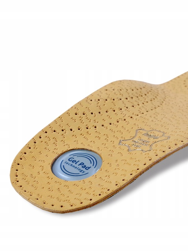 Профилированные стельки с технологией GEL PAD TECHNOLOGY, предназначенные для повседневного использования людьми, страдающими болями в ногах. Верхний слой стельки выполнен из натуральной кожи, которая впитывает пот, выделяемый ногами. В нижнем слое используется латексная пена с активированным углем, которая устраняет неприятные запахи. Гелевая вставка в задней части стельки защищает заднюю часть стопы от негативного воздействия удара пятки о твердую поверхность во время ходьбы. «Подушка» в передней части стопы обеспечивает мягкость и ограничивает образование мозолей и натоптышей. Профилированный элемент стабилизирует стопу и поддерживает продольный свод. Для использования в обуви, такой как туфли, ботинки, ботильоны и ботинки.