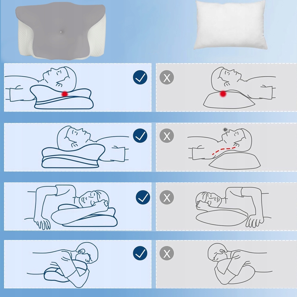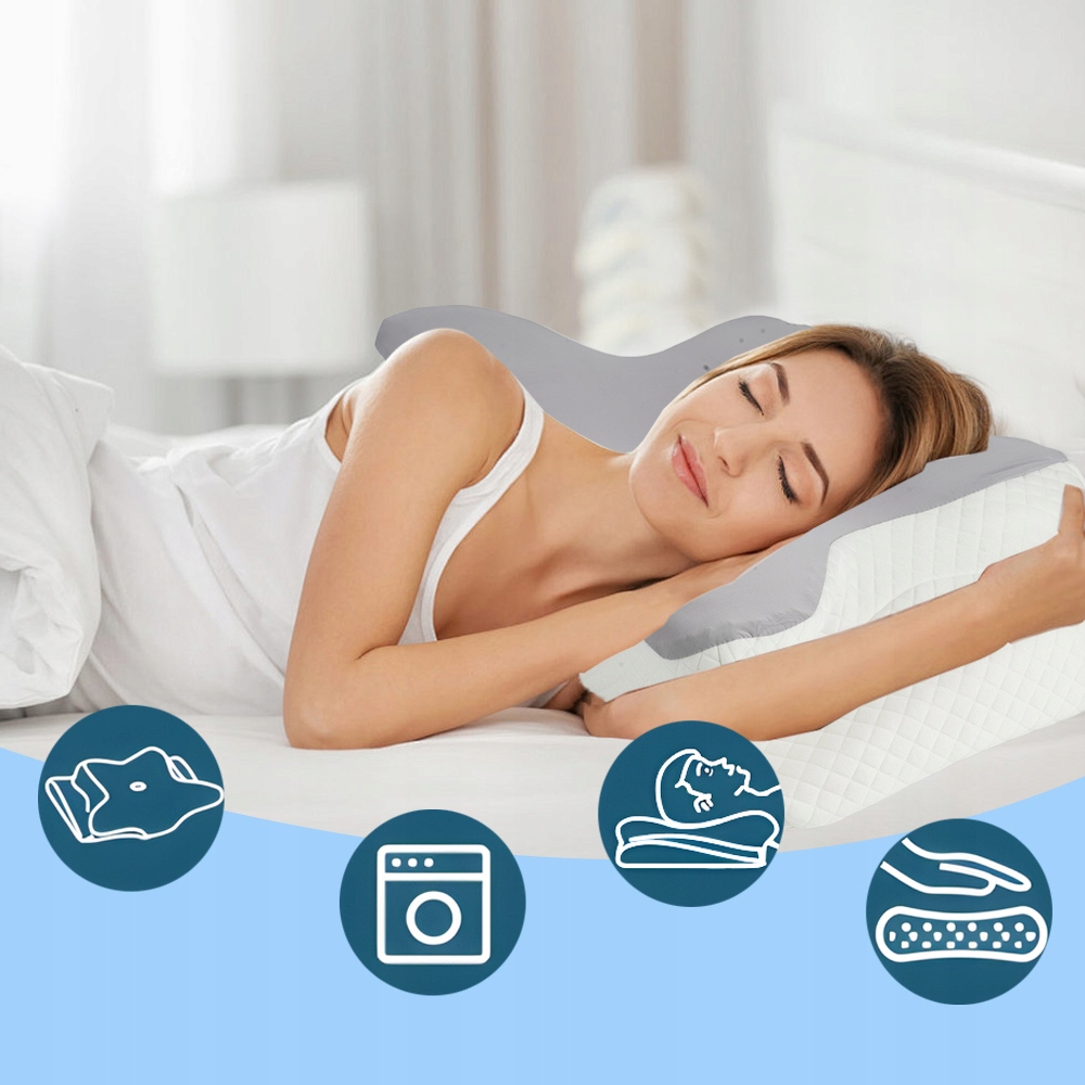 - Эргономичный дизайн поддерживает и стабилизирует голову, шею и плечи, снимает боль и дискомфорт, помогает быстрее и спокойнее заснуть, а также улучшает качество сна.