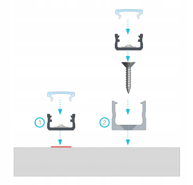 4) Конечный результат установки профиля А с крышкой ВЫСОКОЙ, (1) на двусторонний скотч, (2) с монтажным кронштейном А.
