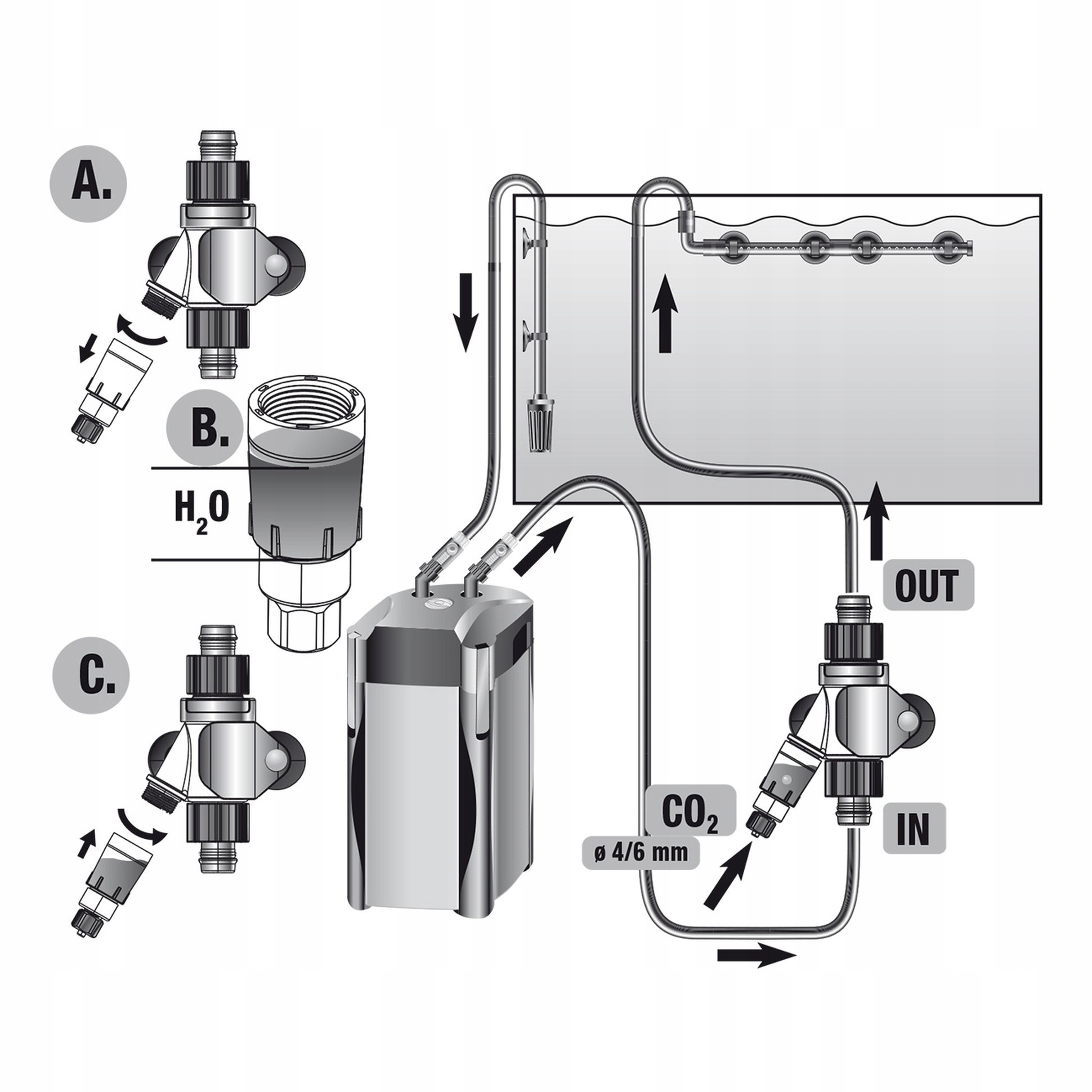 - Прямой диффузор следует устанавливать как можно ближе к внешнему фильтру на шланге, чтобы максимально расширить путь CO2 в шланге.