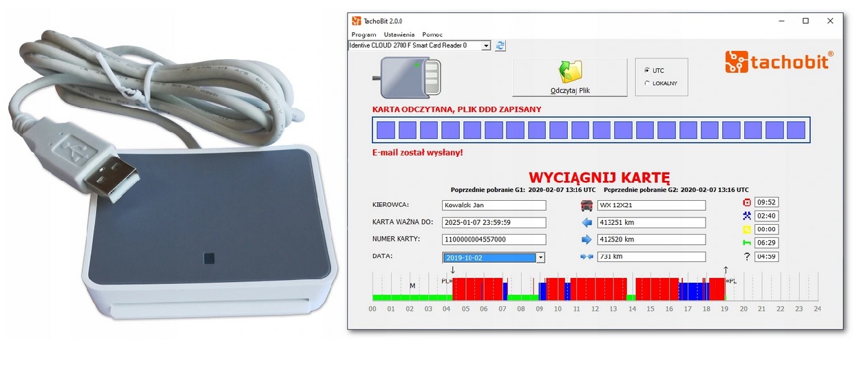 Для загрузки данных с карт водителей необходимо подключить считыватель к компьютеру, на котором установлена программа TachoBit. После считывания карты водителя программа TachoBit сохранит файл DDD и сможет автоматически отправить его по электронной почте или на FTP-сервер.