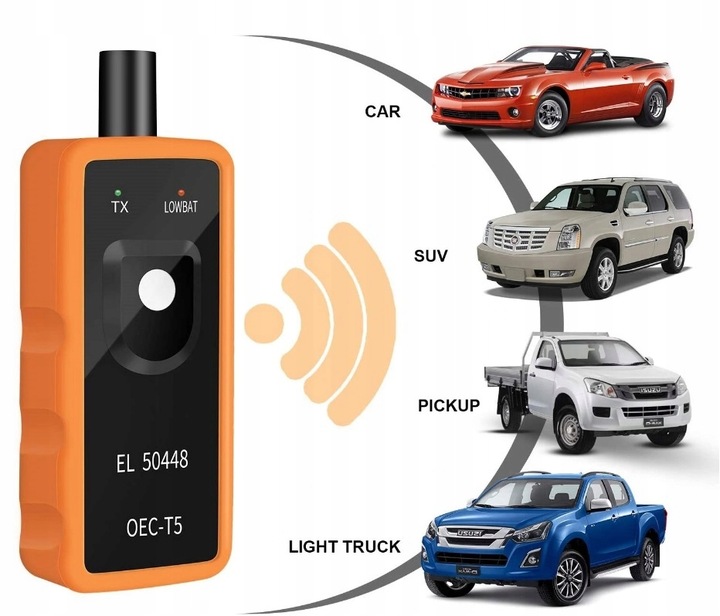 Программатор датчиков TPMS EL-50448 — это устройство, используемое для калибровки датчиков давления в шинах. Активатор работает только с оригинальными датчиками TPMS, у которых частота передачи составляет 433 МГц для европейских автомобилей или 315 МГц для американских автомобилей. Полезно при замене летней резины на зимнюю или наоборот, в случае выхода из строя или повреждения датчика давления в шинах.