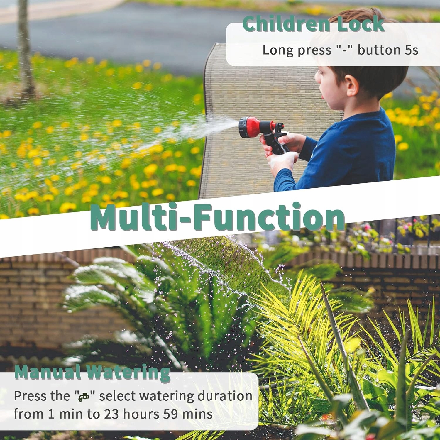 - Многофункциональный таймер полива: режим задержки дождя позволяет приостановить график на 1–7 дней, чтобы избежать чрезмерного полива и сэкономить много воды в дождливые дни. Режим ручного полива позволяет временно поливать, не прерывая установленную программу полива. Режим родительской блокировки защищает таймер полива спринклера от домашних животных и детей.