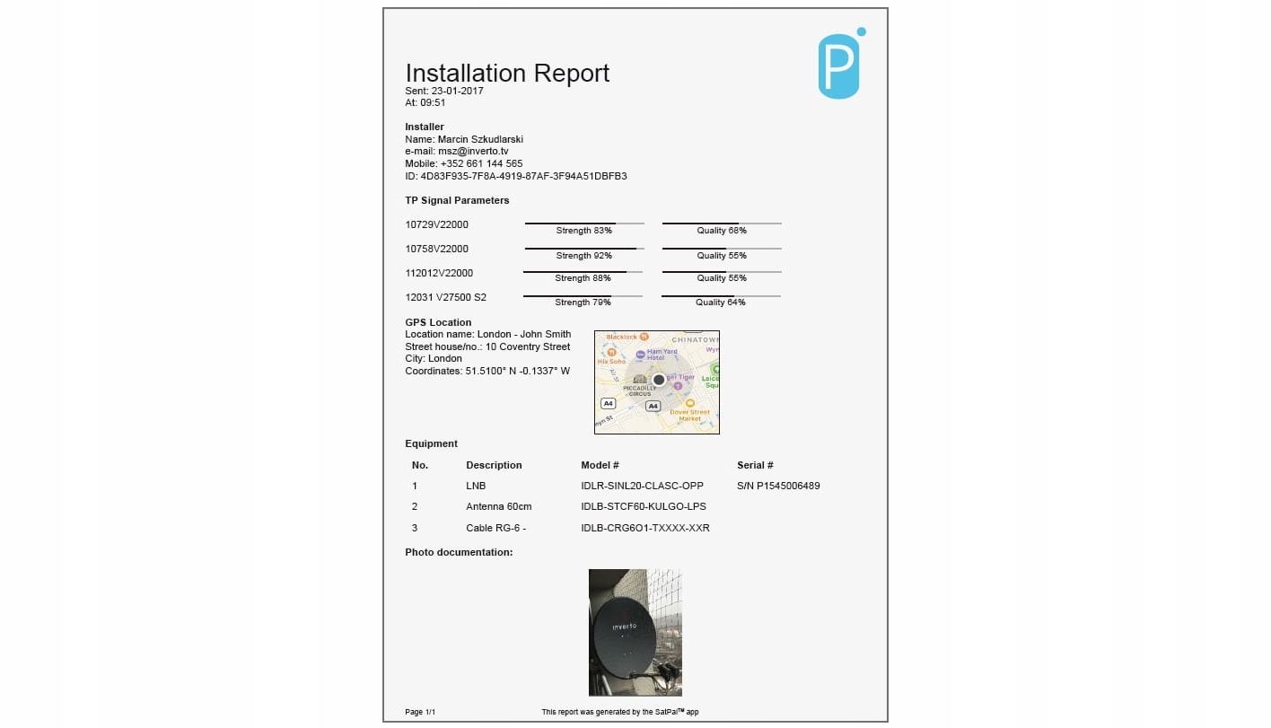 Простой в использовании мастер установки и создания отчетов создает подробные отчеты в различных форматах, включая контактную информацию установщика, данные о месте установки с картой, список установленных устройств с номерами моделей и серийными номерами ( отсканированные или введенные вручную), фотографии установки и данные транспондера. Отчеты отправляются по электронной почте для архивирования и обеспечения полной идентификации установки.