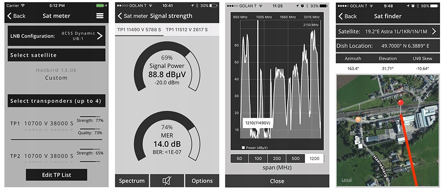 Sat Finder, работающий на основе сигналов GPS, помогает установщику быстро выровнять спутниковую антенну с точными углами азимута и места, а также угла наклона конвертера. Sat Meter оснащен анализатором спектра в реальном времени и позволяет выполнять профессиональные измерения мощности и качества сигнала, MER, BER, PER, C/N и запаса связи. Дополнительный отключаемый зуммер помогает оптимизировать мощность приема в зависимости отуровня и качества сигнала.