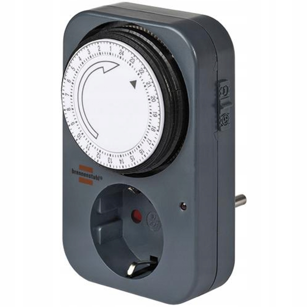 выполнение: Механический программист времени с 24-часовой программой и повышенной защитой от случайного прикосновения. С помощью светодиодного индикатора пластиковые пластинки запечатали контакты гнезда защитным контактом.