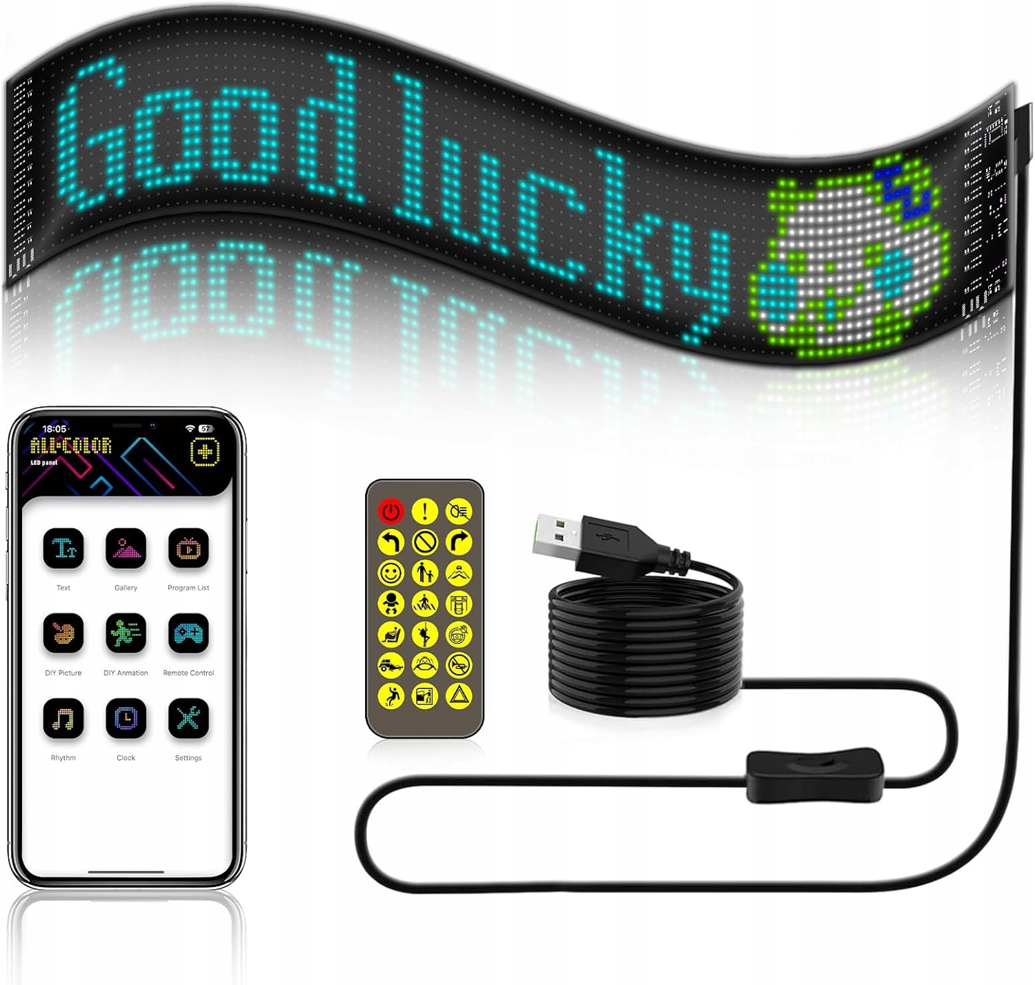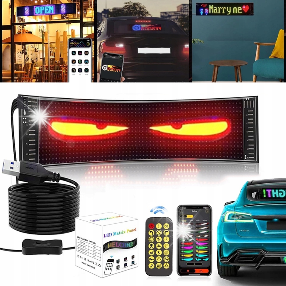 ✨✨ Светодиодная таблица повторной перемещения -светодиодная панель -kind -kind может отображать фотографии, анимации или текущие тексты, показывая людей, используя этот прокрученный светодиодный таблицу с размерами 16 x 96 пикселей. Светодиодные матрицы - панель светодиодной матрицы состоит из высококачественной гибкой конструкции платы и может быть свободно изгиб и сложена. Светодиодная пластина 5 В/2 A с USB -кабелем длиной 4,5 м для питания и клейкой лентой в автомобиле. Он обеспечивает безопасное использование на ветровом стекле автомобиля и заднем стеклом.
