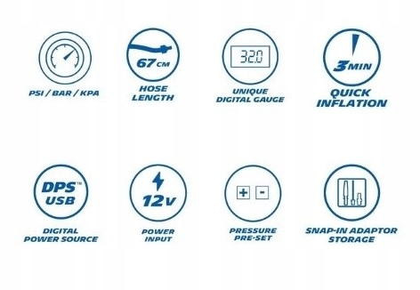 Благодаря компактному дизайну - устройство можно легко хранить в автомобильном шкафчике, багажнике мотоцикла или заправлять воздухом велосипедные шины дома. Цифровой измеритель с точностью от +/- 1 до 50 фунтов на квадратный дюйм. Возможность переключения между фунтами на квадратный дюйм, барами и кПа. Технология цифрового источника питания (DPS) — 1 разъем USB 12 В, идеально подходящий для зарядки мобильных телефонов. Белый цифровой ЖК-дисплей, который делает чтение легким и четким.