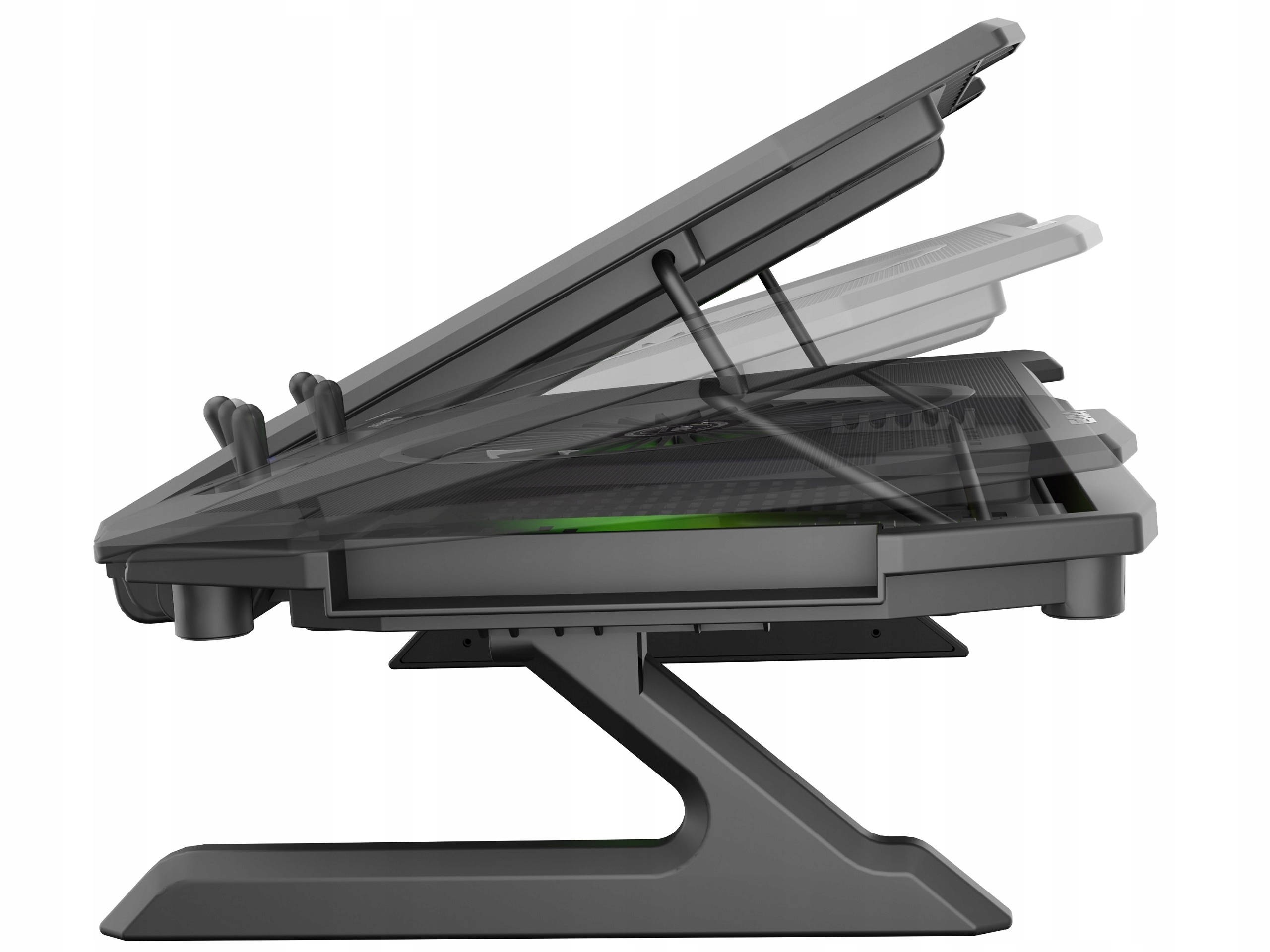 Стенд оснащен эффективной и безопасной системой охлаждения на основе четырех вентиляторов меньшего размера, удаляющих теплый воздух из-под ноутбука, и одного основного вентилятора, подающего холодный воздух. Правильное расположение вентиляторов обеспечивает чрезвычайно эффективное охлаждение, а трехступенчатая регулировка скорости позволит правильно снизить температуру ноутбука даже во время самого напряженного боя.