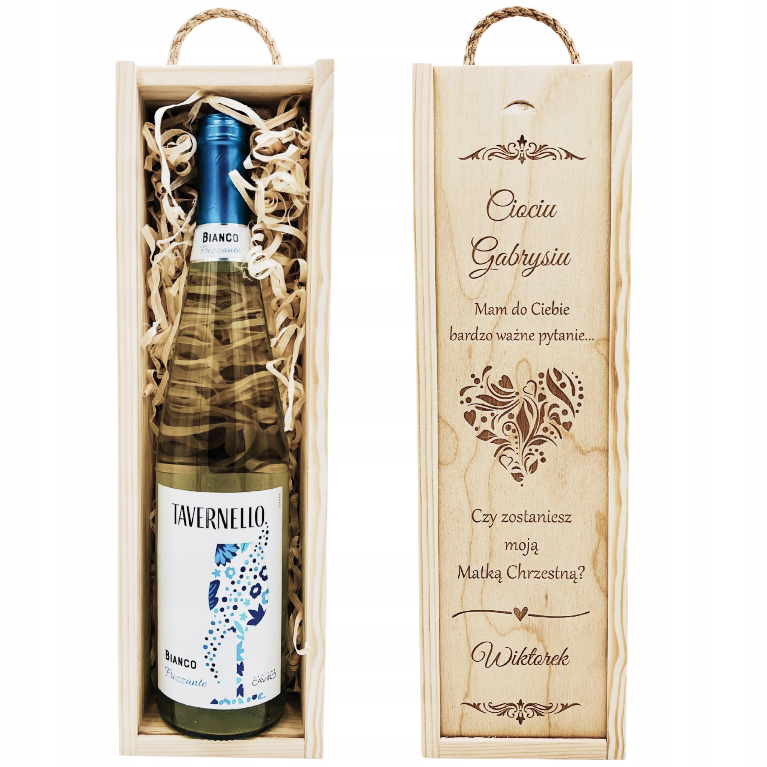 Деревянный вино/алкоголь коробка с гравировкой в виде вопроса для будущего крестного отца. Внутри коробки есть декоративная начинка в светом цвете.