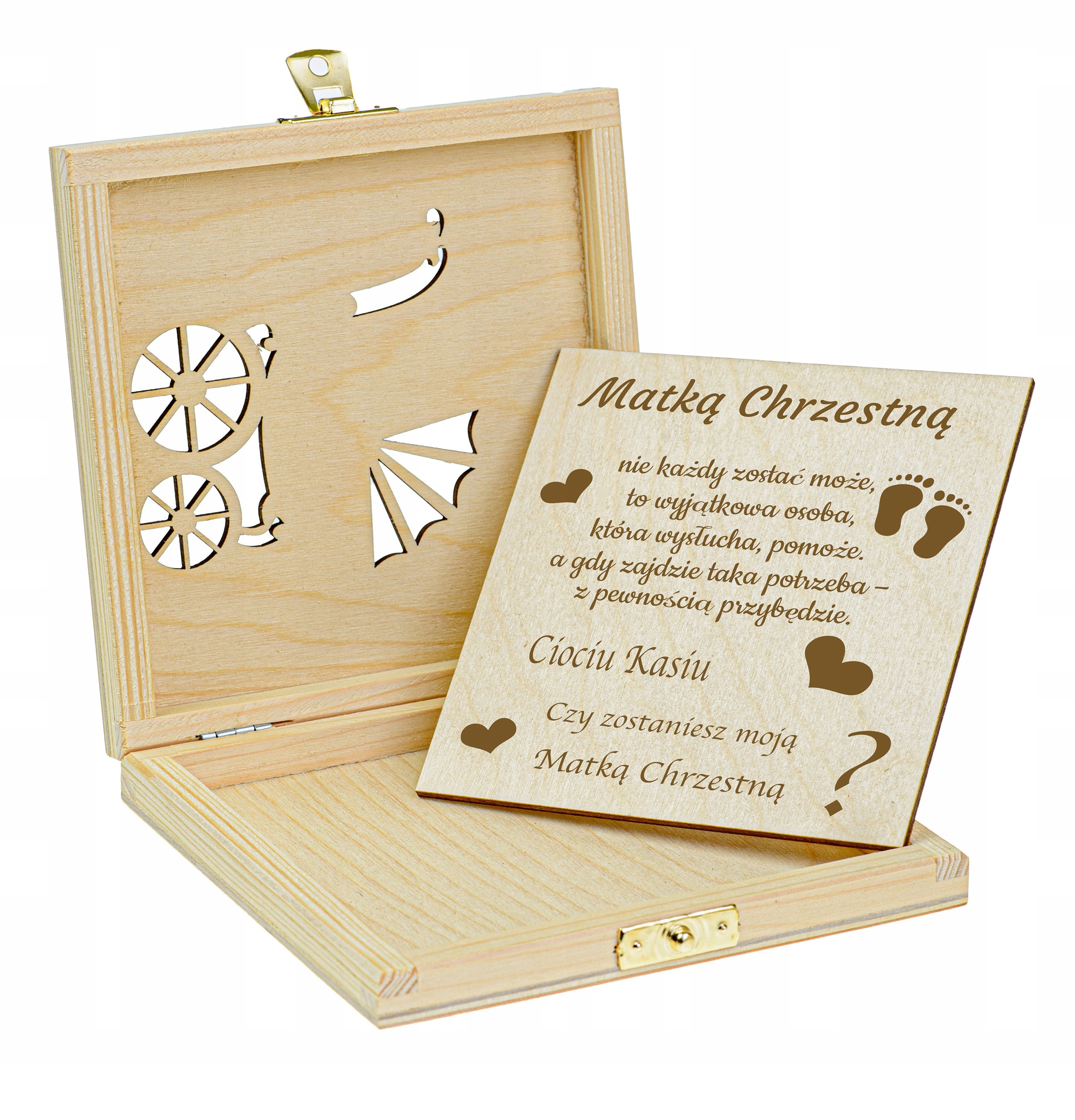 На следующем аукционе мы представляем его Вам в виде деревянной открытки в элегантной плоской коробочке. Запрос к будущей маме или крестному отцу вашего ребенка. Гравировка имен на деревянной карточке и чудесное посвящение, несомненно, станет сувениром на очень долгое время. Этот подарок вызовет улыбку на лице каждого получателя.