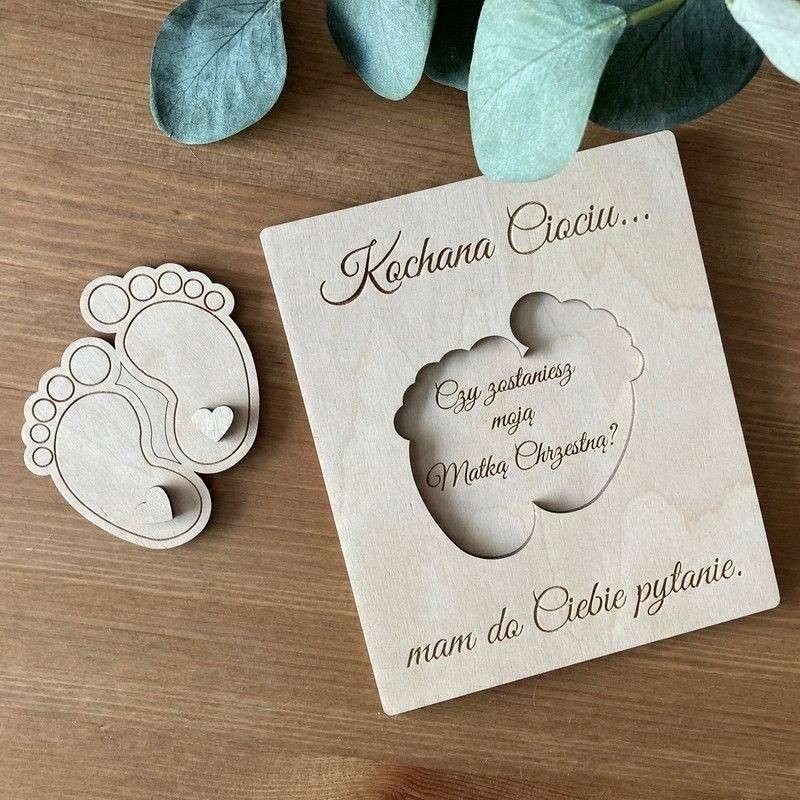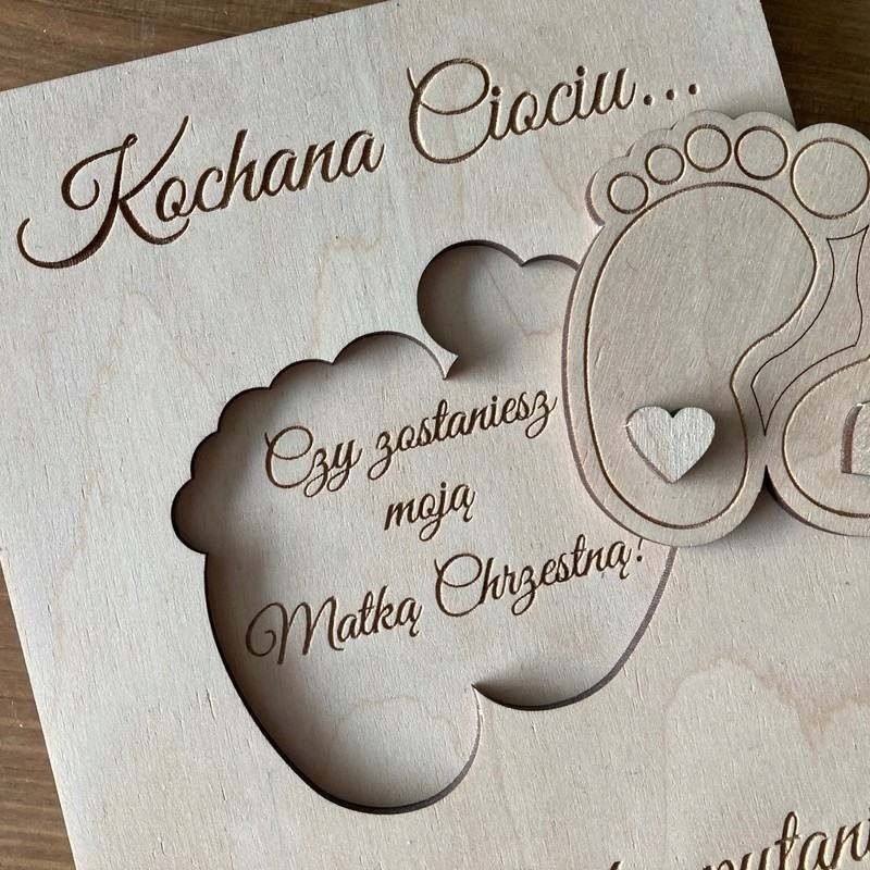 - Композиция: просьба быть Крестной мамой со съемным элементом в виде ножек; запрос имеет подзаголовки: Дорогая тетя... У меня к вам вопрос.; после удаления ног появляется текст: Ты будешь моей крестной?; надписи выгравированы и выполнены с вниманием к мельчайшим деталям - прекрасная польская ручная работа в экологическом стиле.