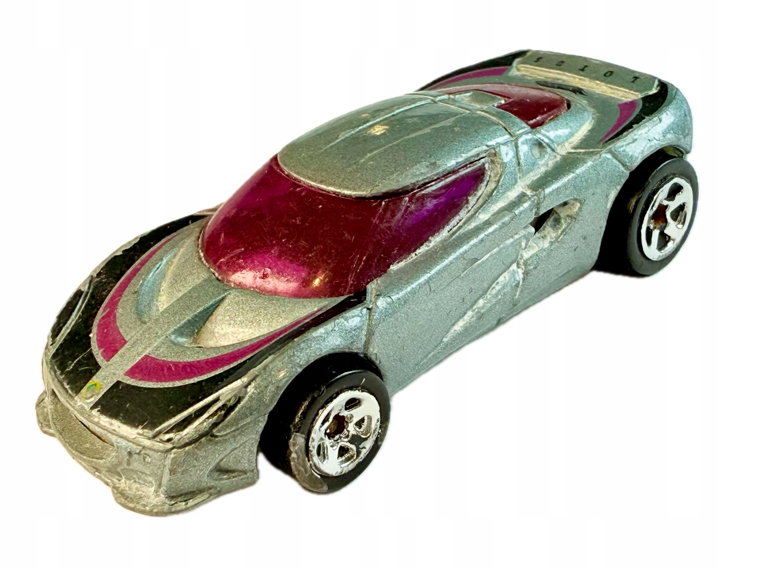 Кузов серебристый, с фиолетовым прозрачным стеклом и принтом, напоминающим гоночные полосы. На спине логотип Hot Wheels и надпись «LOTUS».