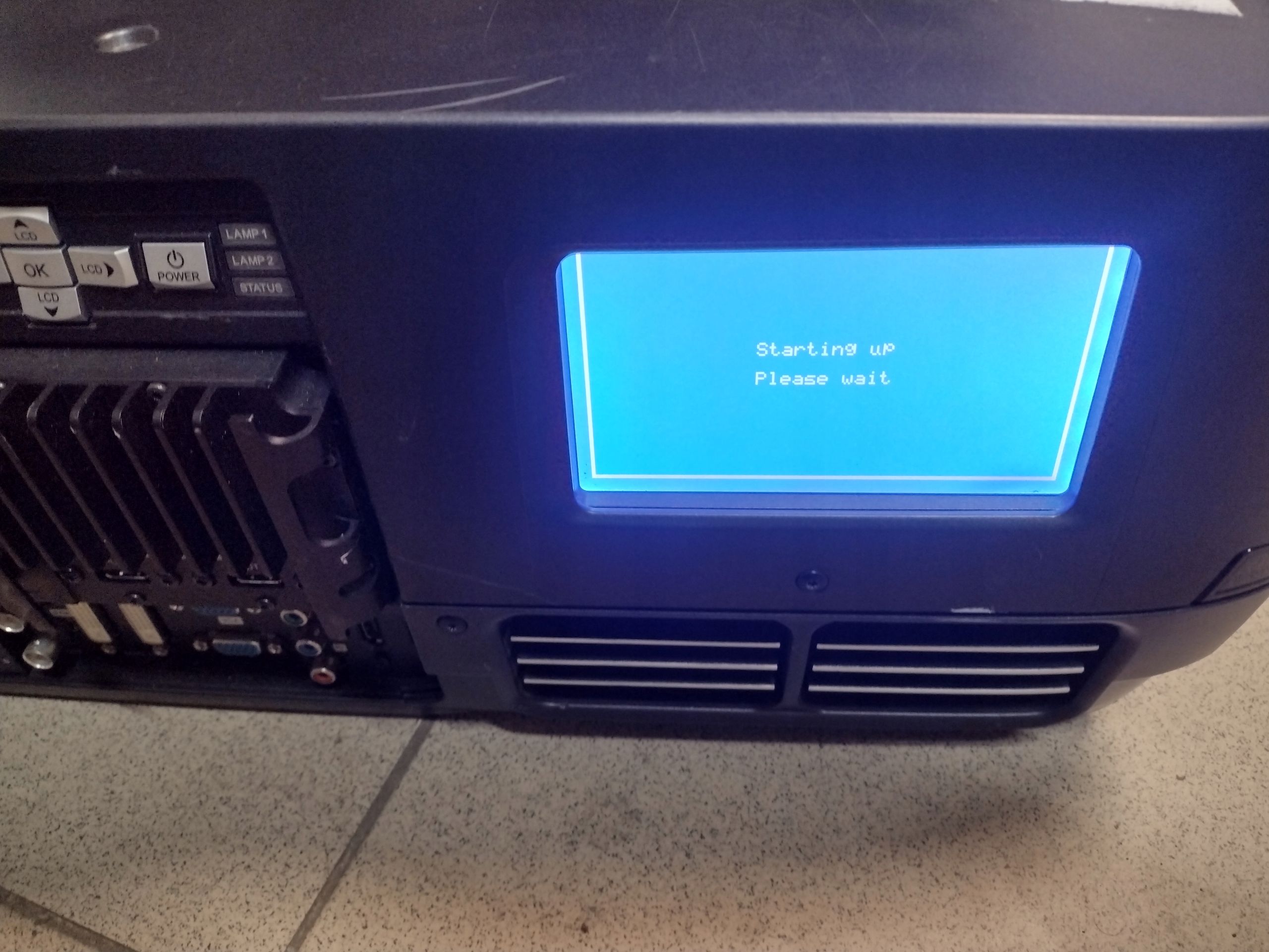 Линзы как на фотографиях, лампы присутствуют. После включения проектора он останавливается на изображении с последней фотографии.
