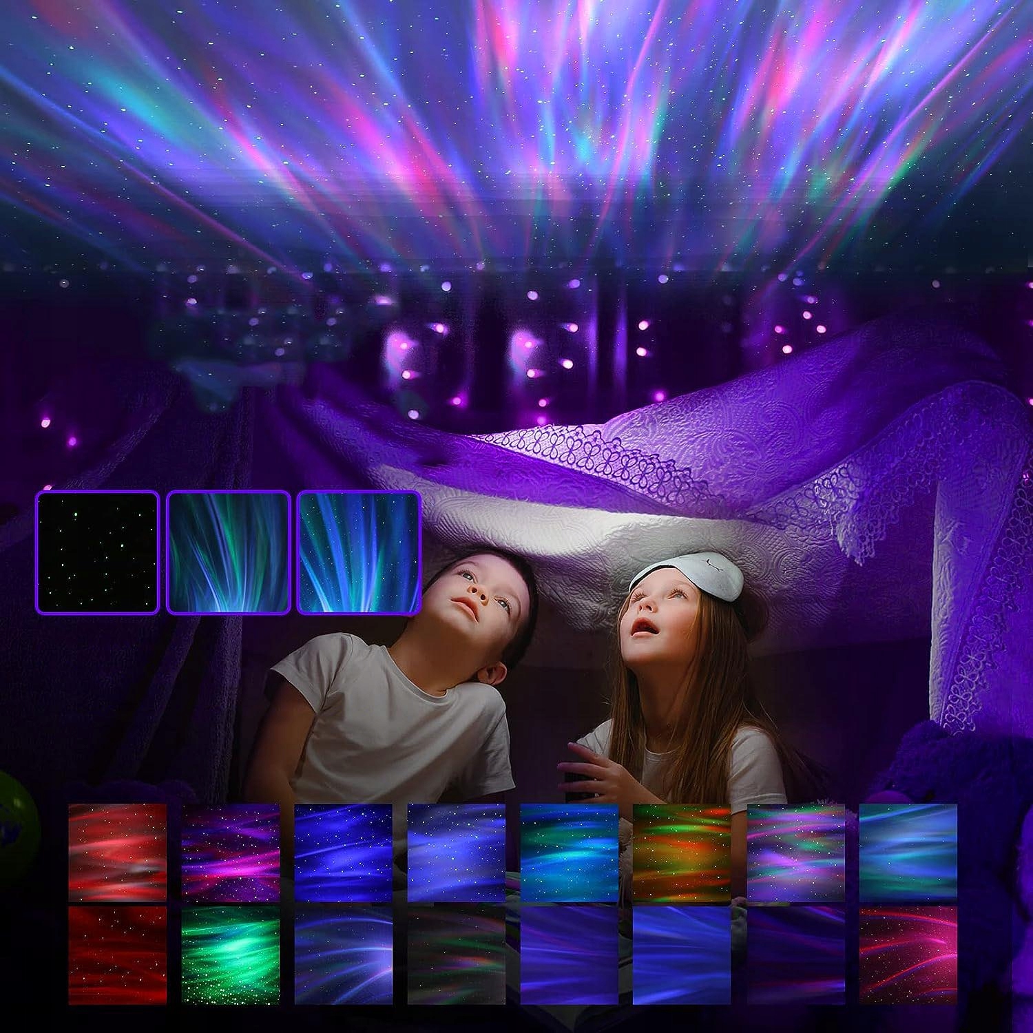 Проектный вид проектора Aurora предлагает комбинацию из 14 цветов (состоит из четырех цветов: зеленый, красный, синий, белый), опоры Не только одно -лорное, два -цвета и три -корровые эффекты полярной ауроры, но также может принести небеса, полные звезд в комнату, чтобы люди чувствовали себя там