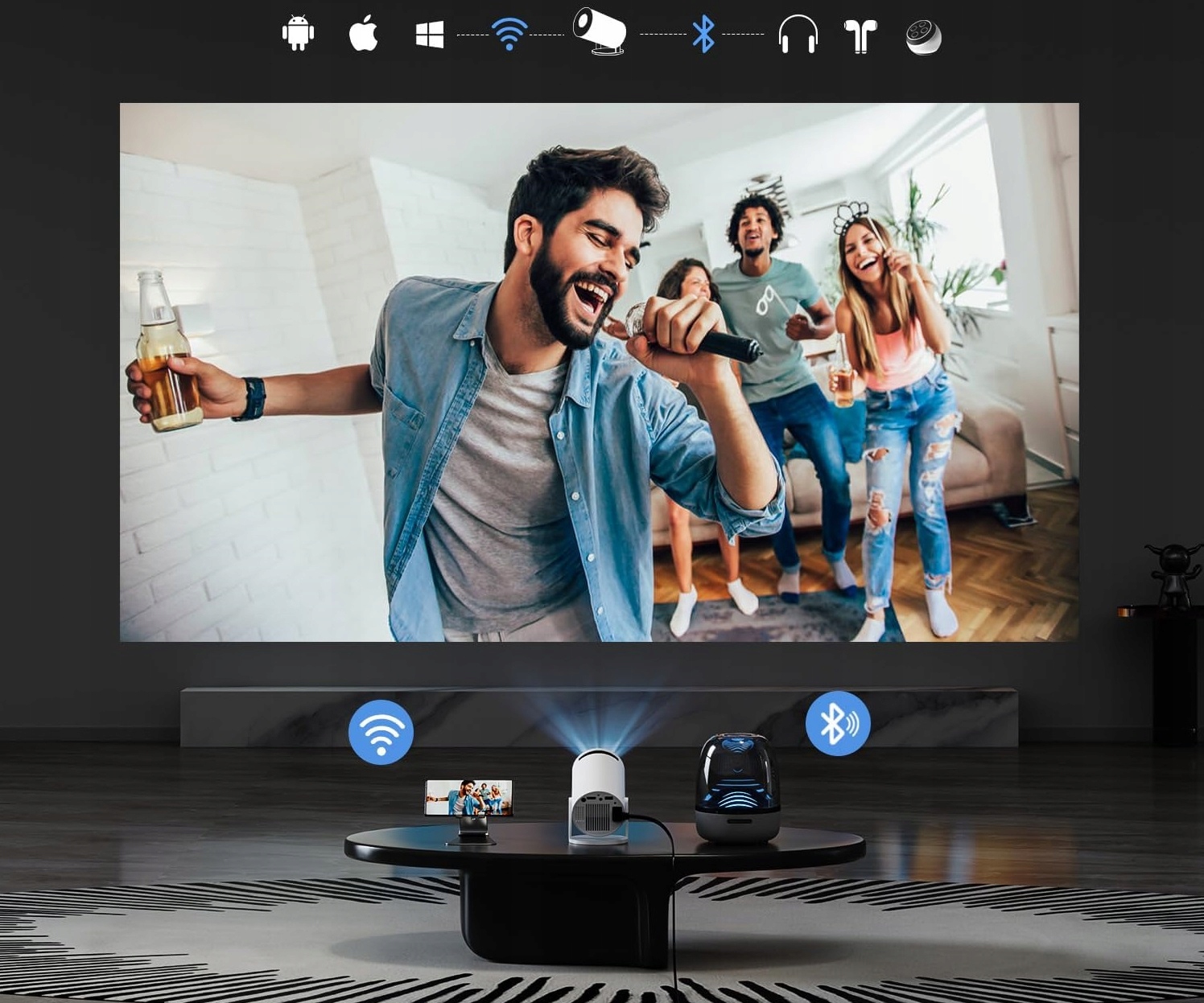 Проектор функционирует как передатчик и приемник Bluetooth, обеспечивая подключение к колонкам, наушникам и другим аудиоустройствам. Идеальное решение для полного звукового погружения."