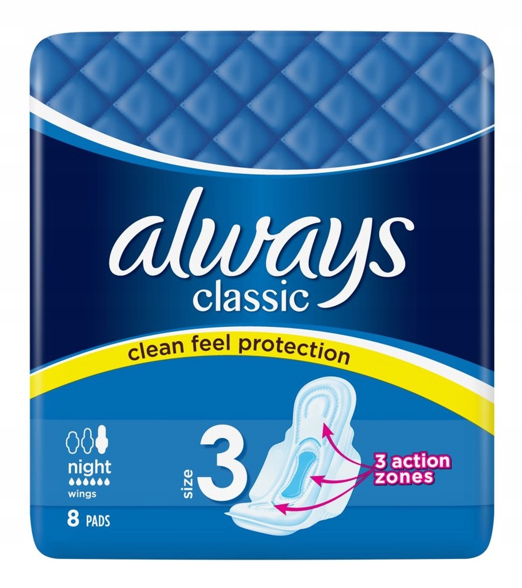 Спи спокойно с гигиеническими прокладками Always Classic Night. Гигиенические прокладки Always Classic Night, разработанные специально для использования в ночное время и во время обильных месячных, обеспечивают дополнительную защиту (по сравнению с гигиеническими прокладками Always Classic Normal и Long). Прокладки Always Classic Night с крыльями и тремя зонами действия обеспечивают защиту и ощущение чистоты всю ночь.