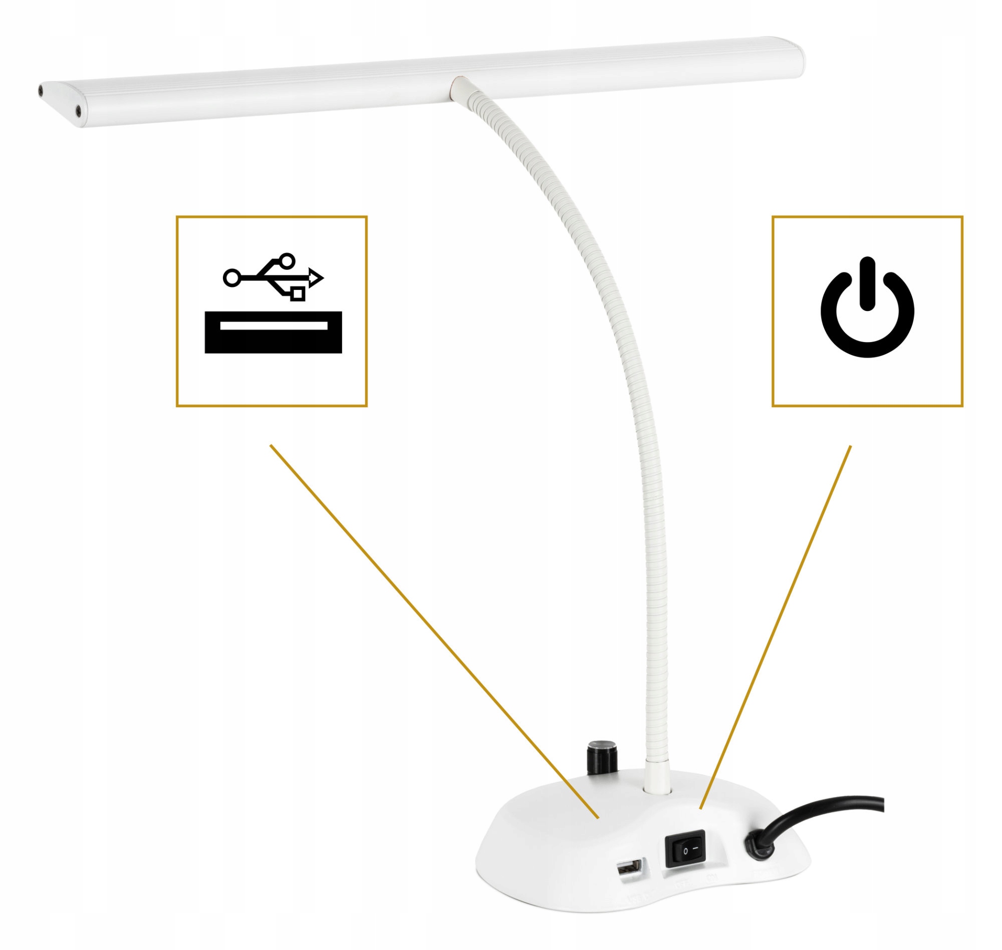 Светодиодная пианино -лампа в белом, некисленном -36 ярких светодиодах, гусиные наборы длиной 38 см для гибкого позиционирования и стабильного основания. Интегрированный USB -зарядный порт для смартфона или планшета.